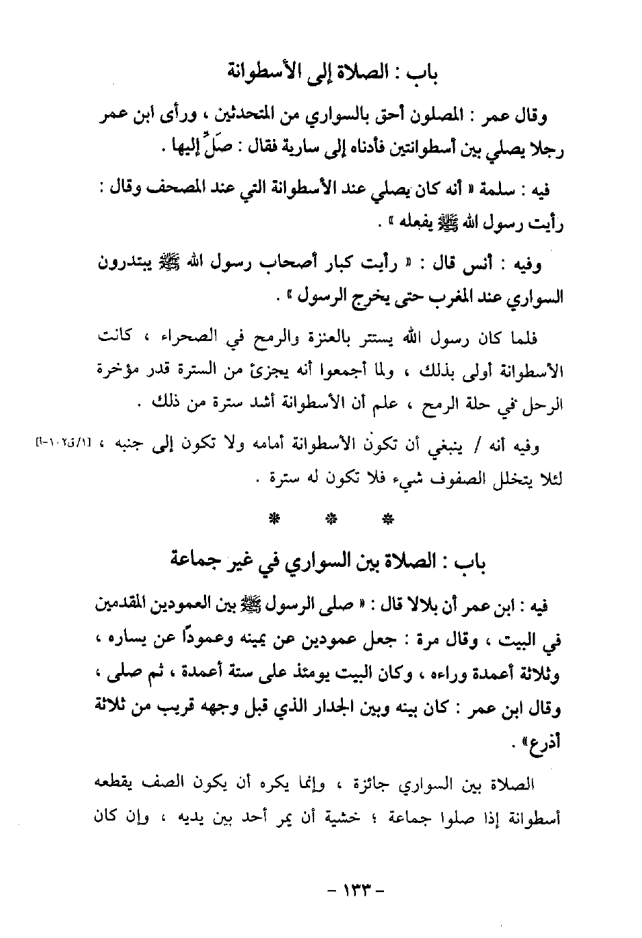 / 121 - فيه: ابن عمر أن بلالاً قال: (صَلَّى الرسول (صلى الله عليه وسلم) بَيْنَ الْعَمُودَيْنِ الْمُقَدَّمَيْنِ فى البيت) . / 122 - وقال مرة: (جَعَلَ عَمُودين عَنْ يَمِينِهِ وَعَمُودًا عَنْ يَسَارِهِ، وَثَلاثَةَ أَعْمِدَةٍ وَرَاءَهُ، وَكَانَ الْبَيْتُ يَوْمَئِذٍ عَلَى سِتَّةِ أَعْمِدَةٍ، ثُمَّ صَلَّى) . / 123 - وقال ابن عمر: كان بينه وبين الجدار الذى قبل وجهه قريب من ثلاثة أذرع. الصلاة بين السوارى جائزة، وإنما يكره أن يكون الصف يقطعه أسطوانة إذا صلوا جماعة؛ خشية أن يمر أحد بين يديه، وإن كان