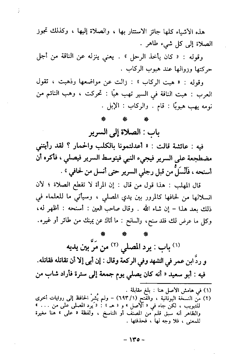 هذه الأشياء كلها جائز الاستتار بها، والصلاة إليها، وكذلك تجوز الصلاة إلى كل شىء طاهر. وقوله: (كان يأخذ الرحل) ، يعنى ينزله عن الناقة من أجل حركتها وزوالها عند هبوب الركاب. وقوله: (هبت الركاب) : زالت عن مواضعها وذهبت، تقول العرب: هبت الناقة فى السير تهب هبّا: تحركت، وهب النائم من نومه يهب هبوبًا: قام، والركاب: الإبل.