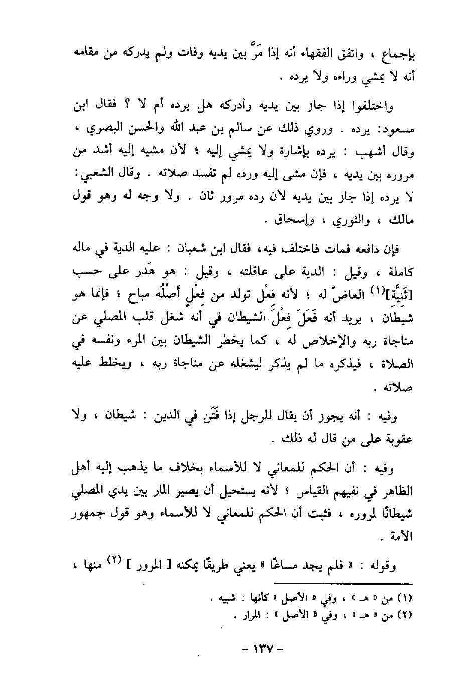 بإجماع، واتفق الفقهاء أنه إذا مَرَّ بين يديه وفات ولم يدركه من مقامه أنه لا يمشى وراءه ولا يرده. واختلفوا إذا جاز بين يديه وأدركه هل يرده أم لا؟ فقال ابن مسعود: يرده، وروى ذلك عن سالم بن عبد الله، والحسن البصرى، وقال أشهب: يرده بإشارة ولا يمشى إليه؛ لأن مشيه إليه أشد من مروره بين يديه، فإن مشى إليه ورده لم تفسد صلاته، وقال الشعبى: لا يرده إذا جاز بين يديه؛ لأن رده مرور ثان، ولا وجه له وهو قول مالك، والثورى، وإسحاق. فإن دافعه فمات فاختلف فيه، فقال اين شعبان: عليه الدية فى ماله كاملة، وقيل: الدية على عاقلته، وقيل: هو هَدر على حسب ثَنِيَّةِ العاضّ له؛ لأنه فِعْل تولد من فِعْل أصله مباح؛ فإنما هو شيطان، يريد أنه فَعَل فِعْلَ الشيطان فى أنه شغل قلب المصلى عن مناجاة ربه والإخلاص له، كما يخطر الشيطان بين المرء ونفسه فى الصلاة، فيذكره ما لم يذكر ليشغله عن مناجاة ربه، ويخلط عليه صلاته. وفيه: أنه يجوز أن يقال للرجل إذا فتن فى الدين: شيطان، ولا عقوبة على من قال له ذلك. وفيه: أن الحكم للمعانى لا للأسماء بخلاف ما يذهب إليه أهل الظاهر فى نفيهم القياس؛ لأنه يستحيل أن يصير المار بين يدى المصلى شيطانًا لمروره، فثبت أن الحكم للمعانى لا للأسماء وهو قول جمهور الأمة. وقوله: (فلم يجد مساغًا) يعنى طريقًا يمكنه المرور منها،