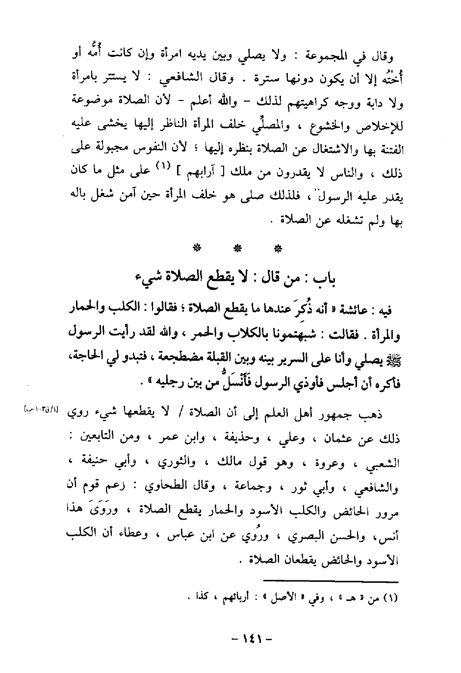 / 131 - فيه: عائشة: أنه ذُكِرَ عِنْدَهَا مَا يَقْطَعُ الصَّلاةَ؛ فقالوا: الْكَلْبُ وَالْحِمَارُ وَالْمَرْأَةُ، فَقَالَتْ: (شَبَّهْتُمُونَا بِالْحُمُرِ وَالْكِلابِ، وَاللَّهِ لَقَدْ رَأَيْتُ الرسول (صلى الله عليه وسلم) يُصَلِّي، وَإِنِّي عَلَى السَّرِيرِ بَيْنَهُ وَبَيْنَ الْقِبْلَةِ مُضْطَجِعَةً، فَتَبْدُو لِيَ الْحَاجَةُ، فَأَكْرَهُ أَنْ أَجْلِسَ، فَأُوذِيَ الرسول، فَأَنْسَلُّ مِنْ بين رِجْلَيْهِ) . ذهب جمهور أهل العلم إلى أن الصلاة لا يقطعها شىء روى ذلك عن عثمان، وعلى، وحذيفة، وابن عمر، ومن التابعين: الشعبى، وعروة، وهو قول مالك، والثورى، وأبى حنيفة، والشافعى، وأبى ثور، وجماعة، وقال الطحاوى: زعم قوم أن مرور الحائض والكلب الأسود والحمار يقطع الصلاة، وروى هذا أنس، والحسن البصرى، وروى عن ابن عباس، وعطاء أن الكلب الأسود والحائض يقطعان الصلاة.