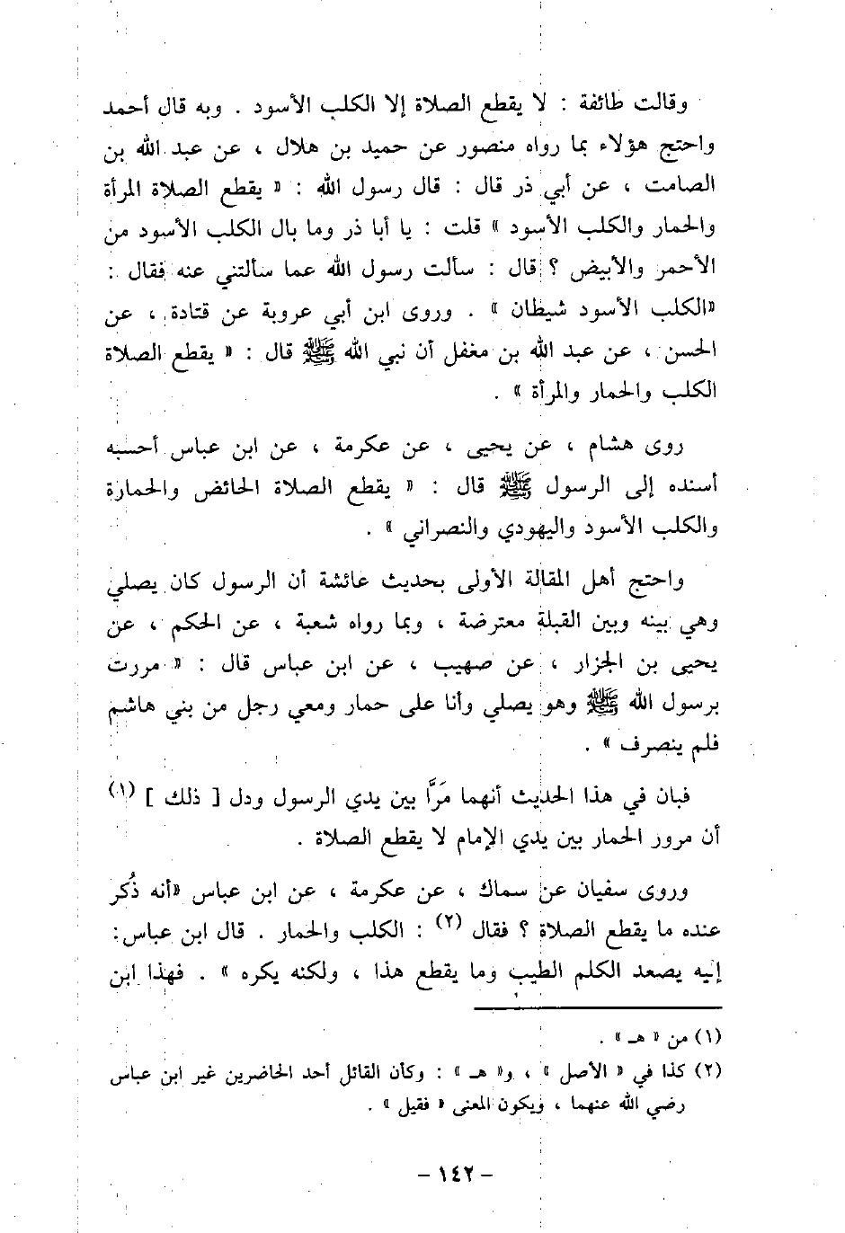 وقالت طائفة: لا يقطع الصلاة إلا الكلب الأسود، وبه قال أحمد واحتج هؤلاء بما رواه منصور عن حميد بن هلال، عن عبد الله بن الصامت، عن أبى ذر قال: قال رسول الله: (يقطع الصلاة المرأة والحمار والكلب الأسود) قلت: يا أبا ذر وما بال الكلب الأسود من الأحمر والأبيض؟ قال: سألت رسول الله عما سألتنى عنه فقال: (الكلب الأسود شيطان) . وروى ابن أبى عروبة عن قتادة، عن الحسن، عن عبد الله بن مغفل، أن نبى الله (صلى الله عليه وسلم) قال: (يقطع الصلاة الكلب والحمار والمرأة) . روى هشام، عن يحيى، عن عكرمة، عن ابن عباس أحسبه أسنده إلى الرسول (صلى الله عليه وسلم) قال: (يقطع الصلاة الحائض والحمارة والكلب الأسود واليهودى والنصرانى) . واحتج أهل المقالة الأولى بحديث عائشة أن الرسول كان يصلى وهى بينه وبين القبلة معترضة، وبما رواه شعبة، عن الحكم، عن يحيى بن الجزار، عن صهيب، عن ابن عباس قال: (مررت برسول الله (صلى الله عليه وسلم) وهو يصلى وأنا على حمار ومعى رجل من بنى هاشم فلم ينصرف) . فبان فى هذا الحديث أنهما مرَّا بين يدى الرسول ودل ذلك أن مرور الحمار بين يدى الإمام لا يقطع الصلاة. وروى سفيان عن سماك، عن عكرمة، عن ابن عباس (أنه ذكر عنده ما يقطع الصلاة؟ فقال: الكلب والحمار، قال ابن عباس: إليه يصعد الكلم الطيب وما يقطع هذا، ولكنه يكره) . فهذا ابن
