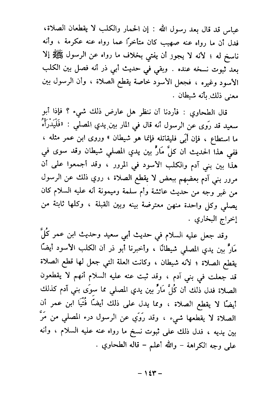 عباس قد قال بعد رسول الله: إن الحمار والكلب لا يقطعان الصلاة، فدل أن ما رواه عنه صهيب كان متأخرًا عما رواه عنه عكرمة، وأنه ناسخ له؛ لأنه لا يجوز أن يفتى بخلاف ما رواه عن الرسول (صلى الله عليه وسلم) إلا بعد ثبوت نسخه عنده، وبقى فى حديث أبى ذر أنه فصل بين الكلب الأسود وغيره، فجعل الأسود خاصة يقطع الصلاة، وأن الرسول بين معنى ذلك بأنه شيطان. قال الطحاوى: فأردنا أن ننظر هل عارض ذلك شىء؟ فإذا أبو سعيد قد روى عن الرسول أنه قال فى المار بين يدى المصلى: (فليدرأهُ ما استطاع، فإن أبى فليقاتله فإنما هو شيطان) ، وروى ابن عمر مثله، ففى هذا الحديث أن كل مارٍّ بين يدى المصلى شيطان، وقد سوى فى هذا بين بنى آدم والكلب الأسود فى المرور، وقد أجمعوا على أن مرور بنى آدم بعضهم ببعض لا يقطع الصلاة، روى ذلك عن الرسول من غير وجه من حديث عائشة وأم سلمة، وميمونة أنه عليه السلام كان يصلى وكل واحدة منهن معترضة بينه وبين القبلة، وكلها ثابتة من إخراج البخارى. وقد جعل عليه السلام فى حديث أبى سعيد، وحديث ابن عمر كُلَّ مارٍّ بين يدى المصلى شيطانًا، وأخبرنا أبو ذر أن الكلب الأسود أيضًا يقطع الصلاة؛ لأنه شيطان، وكانت العلة التى جعل لها قطع الصلاة قد جعلت فى بنى آدم، وقد ثبت عنه عليه السلام أنهم لا يقطعون الصلاة، فدل ذلك أن كل مارٍّ بين يدى المصلى مما سوى بنى آدم كذلك أيضًا لا يقطع الصلاة، ومما يدل على ذلك أيضًا فُتيا ابن عمر أن الصلاة لا يقطعها شىء، وقد روى عن الرسول درء المصلى من مرَّ بين يديه، فدل ذلك على ثبوت نسخ ما رواه عنه، عليه السلام، وأنه على وجه الكراهة، والله أعلم، قاله الطحاوى.