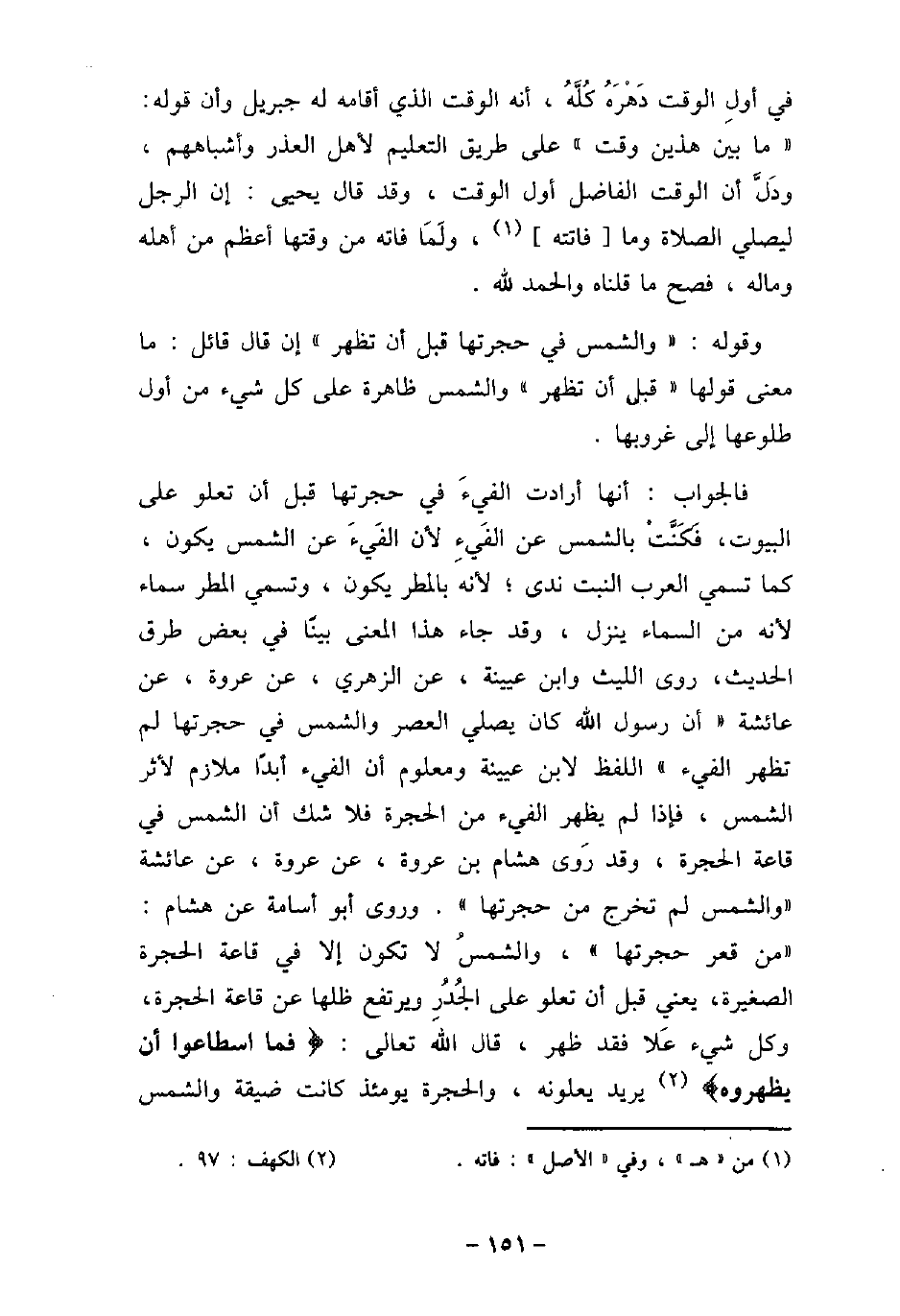 فى أول الوقت دَهْرَهُ كُلَّهُ، أنه الوقت الذى أقامه له جبريل وأن قوله: (ما بين هذين وقت) ، على طريق التعليم لأهل العذر وأشباههم، ودل أن الوقت الفاضل أول الوقت، وقد قال يحيى: إن الرجل ليصلى الصلاة وما فاتته، ولما فاته من وقتها أعظم من أهله وماله، فصح ما قلناه والحمد لله. وقوله: (والشمس فى حجرتها قبل أن تظهر) ، إن قال قائل: ما معنى قولها: (قبل أن تظهر) والشمس ظاهرة على كل شىء من أول طلوعها إلى غروبها. فالجواب: أنها أرادت الفىء فى حجرتها قبل أن تعلو على البيوت، فَكَنَّتْ بالشمس عن الفىء؛ لأن الفىء عن الشمس يكون، كما يسمى العرب النبت ندى؛ لأنه بالمطر يكون، وتسمى المطر سماء؛ لأنه من السماء ينزل، وقد جاء هذا المعنى بينًا فى بعض طرق الحديث، روى الليث، وابن عيينة، عن الزهرى، عن عروة، عن عائشة: (أن رسول الله كان يصلى العصر والشمس فى حجرتها لم تظهر الفىء) ، اللفظ لابن عيينة، ومعلوم أن الفىء أبدًا ملازم لأثر الشمس، فإذا لم يظهر الفىء من الحجرة فلا شك أن الشمس فى قاعة الحجرة، وقد روى هشام بن عروة، عن عروة، عن عائشة: (والشمس لم تخرج من حجرتها) ، وروى أبو أسامة، عن هشام: (من قعر حجرتها) ، والشمس لا تكون إلا فى قاعة الحجرة الصغيرة، يعنى قبل أن تعلو على الجُدُرِ ويرتفع ظلها عن قاعة الحجرة، وكل شىء علا فقد ظهر، قال الله تعالى: (فما اسطاعوا أن يظهروه) [الكهف: 97] ، يريد يعلونه، والحجرة يومئذ كانت ضيقة والشمس