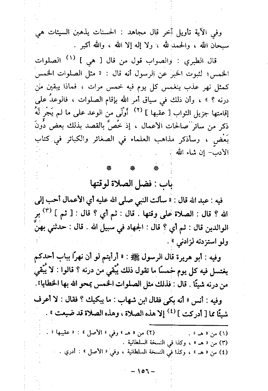 / 6 - فيه: عَبْدِاللَّهِ قَالَ: (سَأَلْتُ النَّبِيَّ (صلى الله عليه وسلم) أَيُّ الأعَمَالِ أَحَبُّ إِلَى اللَّهِ؟ قَالَ: الصَّلاةُ عَلَى وَقْتِهَا، قَالَ: ثُمَّ أَيٌّ؟ قَالَ: ثُمَّ بِرُّ الْوَالِدَيْنِ، قَالَ: ثُمَّ أَيٌّ؟ ، قَالَ: الْجِهَادُ فِي سَبِيلِ اللَّهِ) قَالَ: حَدَّثَنِي بِهِنَّ، وَلَوِ اسْتَزَدْتُهُ لَزَادَنِي. / 7 - وفيه: أبو هريرة، قال الرسول (صلى الله عليه وسلم) : (أَرَأَيْتُمْ لَوْ أَنَّ نَهَرًا بِبَابِ أَحَدِكُمْ يَغْتَسِلُ فِيهِ كُلَّ يَوْمٍ خَمْسًا، مَا تَقُولُ ذَلِك، يُبْقِي مِنْ دَرَنِهِ؟ قَالُوا: لا يُبْقِي مِنْ دَرَنِهِ شَيْئًا، قَالَ: فَذَلِكَ مِثْلُ الصَّلَوَاتِ الْخَمْسِ، يَمْحُو اللَّهُ بِهَا الْخَطَايَا) . / 8 - وفيه: أنس: أنه بكى فقال ابن شهاب: ما يبكيك؟ فقال: لا أعرف شيئًا مما أدركت إلا هذه الصلاة، وهذه الصلاة قد ضيعت.