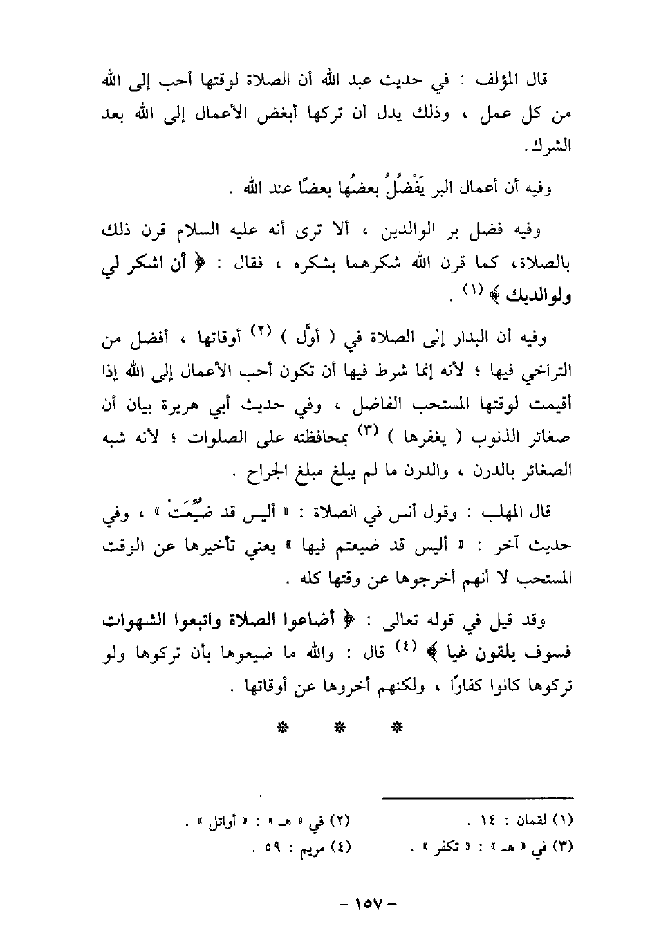 قال المؤلف: فى حديث عبد الله أن الصلاة لوقتها أحب إلى الله من كل عمل، وذلك يدل أن تركها أبغض الأعمال إلى الله بعد الشرك. وفيه: أن أعمال البر يفضلُ بعضها بعضًا عند الله. وفيه: فضل بر الوالدين، ألا ترى أنه عليه السلام، قرن ذلك بالصلاة، كما قرن الله شكرهما بشكره، فقال: (أن اشكر لى ولوالديك) [لقمان: 14] . وفيه: أن البدار إلى الصلاة فى أول أوقاتها، أفضل من التراخى فيها؛ لأنه إنما شرط فيها أن تكون أحب الأعمال إلى الله إذا أقيمت لوقتها المستحب الفاضل، وفى حديث أبى هريرة بيان أن صغائر الذنوب يغفرها بمحافظته على الصلوات؛ لأنه شبه الصغائر بالدرن، والدرن ما لم يبلغ مبلغ الجراح. قال المهلب: وقول أنس فى الصلاة: (أليس قد ضُيعتْ) ، وفى حديث آخر: (أليس قد ضيعتم فيها) ، يعنى تأخيرها عن الوقت المستحب لا أنهم أخرجوها عن وقتها كله. وقد قيل فى قوله تعالى: (أضاعوا الصلاة واتبعوا الشهوات فسوف يلقون غيا) [مريم: 59] ، قال: والله ما ضيعوها بأن تركوها ولو تركوها كانوا كفارًا، ولكنهم أخروها عن أوقاتها.