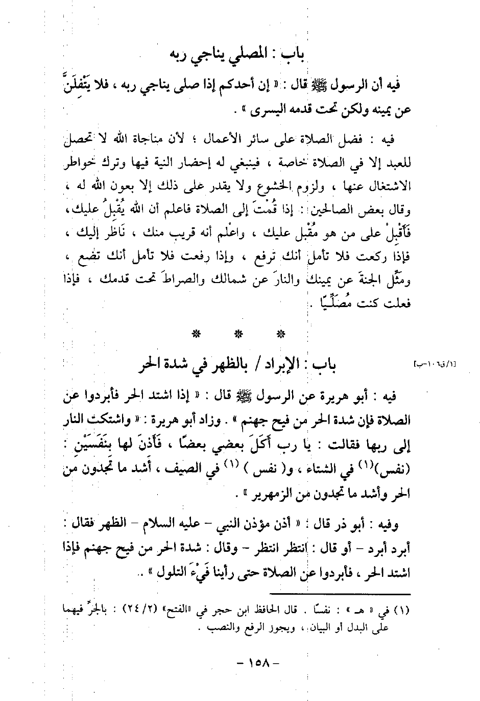 / 10 - فيه: أبو هريرة، عن الرسول (صلى الله عليه وسلم) قال: (إِذَا اشْتَدَّ الْحَرُّ، فَأَبْرِدُوا عَنِ الصَّلاةِ، فَإِنَّ شِدَّةَ الْحَرِّ مِنْ فَيْحِ جَهَنَّمَ) . / 11 - وزاد، أبو هريرة:: (وَاشْتَكَتِ النَّارُ إِلَى رَبِّهَا، فَقَالَتْ: يَا رَبِّ أَكَلَ بَعْضِي بَعْضًا، فَأَذِنَ لَهَا بِنَفَسَيْنِ: نَفَسٍ فِي الشِّتَاءِ، وَنَفَسٍ فِي الصَّيْفِ، أَشَدُّ مَا تَجِدُونَ مِنَ الْحَرِّ، وَأَشَدُّ مَا تَجِدُونَ مِنَ الزَّمْهَرِيرِ) . / 12 - وفيه: أبو ذر قال: أَذَّنَ مُؤَذِّنُ النَّبِيِّ عليه السلام، الظُّهْرَ فَقَالَ: (أَبْرِدْ، أَبْرِدْ - أَوْ قَالَ: انْتَظِرِ انْتَظِرْ - وَقَالَ: شِدَّةُ الْحَرِّ مِنْ فَيْحِ جَهَنَّمَ، فَإِذَا اشْتَدَّ الْحَرُّ، فَأَبْرِدُوا عَنِ الصَّلاةِ، حَتَّى رَأَيْنَا فَيْءَ التُّلُولِ) .