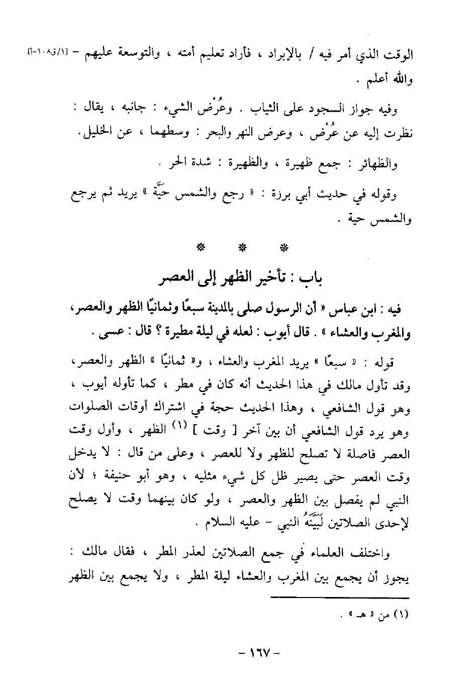 / 16 - فيه: ابْنِ عَبَّاسٍ: (أَنَّ الرسول صَلَّى بِالْمَدِينَةِ سَبْعًا وَثَمَانِيًا الظُّهْرَ وَالْعَصْرَ وَالْمَغْرِبَ وَالْعِشَاءَ) ، قَالَ أَيُّوبُ: لَعَلَّهُ فِي لَيْلَةٍ مَطِيرَةٍ؟ ، قَالَ: عَسَى. قوله: (سبعًا) يريد المغرب والعشاء، و (ثمانيًا) الظهر والعصر، وقد تأول مالك فى هذا الحديث أنه كان فى مطر، كما تأوله أيوب، وهو قول الشافعى، وهذا الحديث حجة فى اشتراك أوقات الصلوات وهو يرد قول الشافعى أن بين آخر وقت الظهر، وأول وقت العصر فاصلة لا تصلح للظهر ولا للعصر، وعلى من قال: لا يدخل وقت العصر حتى يصير ظل كل شىء مثليه، وهو أبو حنيفة؛ لأن النبى لم يفصل بين الظهر والعصر، ولو كان بينهما وقت لا يصلح لإحدى الصلاتين لبينه النبى، عليه السلام. واختلف العلماء فى جمع الصلاتين لعذر المطر، فقال مالك: يجوز أن يجمع بين المغرب والعشاء ليلة المطر، ولايجمع بين الظهر