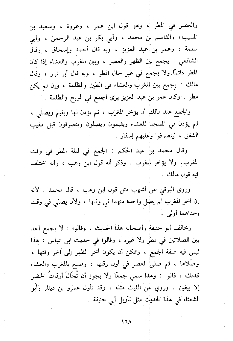 والعصر فى المطر، وهو قول ابن عمر، وعروة، وسعيد بن المسيب، والقاسم بن بن محمد، وأبى بكر بن عبد الرحمن، وأبى سلمة، وعمر بن عبد العزيز، وبه قال أحمد وإسحاق، وقال الشافعى: يجمع بين الظهر والعصر، وبين المغرب والعشاء، إذا كان المطر دائمًا ولا يجمع فى غير حال المطر، وبه قال أبو ثور، وقال مالك: يجمع بين المغرب والعشاء فى الطين والظلمة، وإن لم يكن مطر، وكان عمر بن عبد العزيز يرى الجمع فى الريح والظلمة. والجمع عند مالك أن يؤخر المغرب، ثم يؤذن لها ويقيم ويصلى، ثم يؤذن فى المسجد للعشاء ويقيمون ويصلون وينصرفون قبل مغيب الشفق، لينصرفوا وعليهم إسفار. وقال محمد بن عبد الحكم: الجمع فى ليلة المطر فى وقت المغرب، ولا يؤخر المغرب، وذكر أنه قول ابن وهب، وأنه اختلف فيه قول مالك. وروى البرقى عن أشهب مثل قول ابن وهب، قال محمد: لأنه إن أخر المغرب لم يصل واحدة منهما فى وقتها؛ ولأن يصلى فى وقت إحداهما أولى. وخالف أبو حنيفة وأصحابه هذا الحديث، وقالوا: لا يجمع أحد بين الصلاتين فى مطر ولا غيره، وقالوا فى حديث ابن عباس: هذا ليس فيه صفة الجمع، وممكن أن يكون أخر الظهر إلى آخر وقتها، وصلاها، ثم صلى العصر فى أول وقتها، وصنع بالمغرب والعشاء كذلك، قالوا: وهذا سمى جمعًا ولا يجوز أن تُحال أوقات الحضر إلا بيقين، وروى عن الليث مثله، وقد تأول عمرو بن دينار، وأبو الشعثاء فى هذا الحديث مثل تأويل أبى حنيفة.