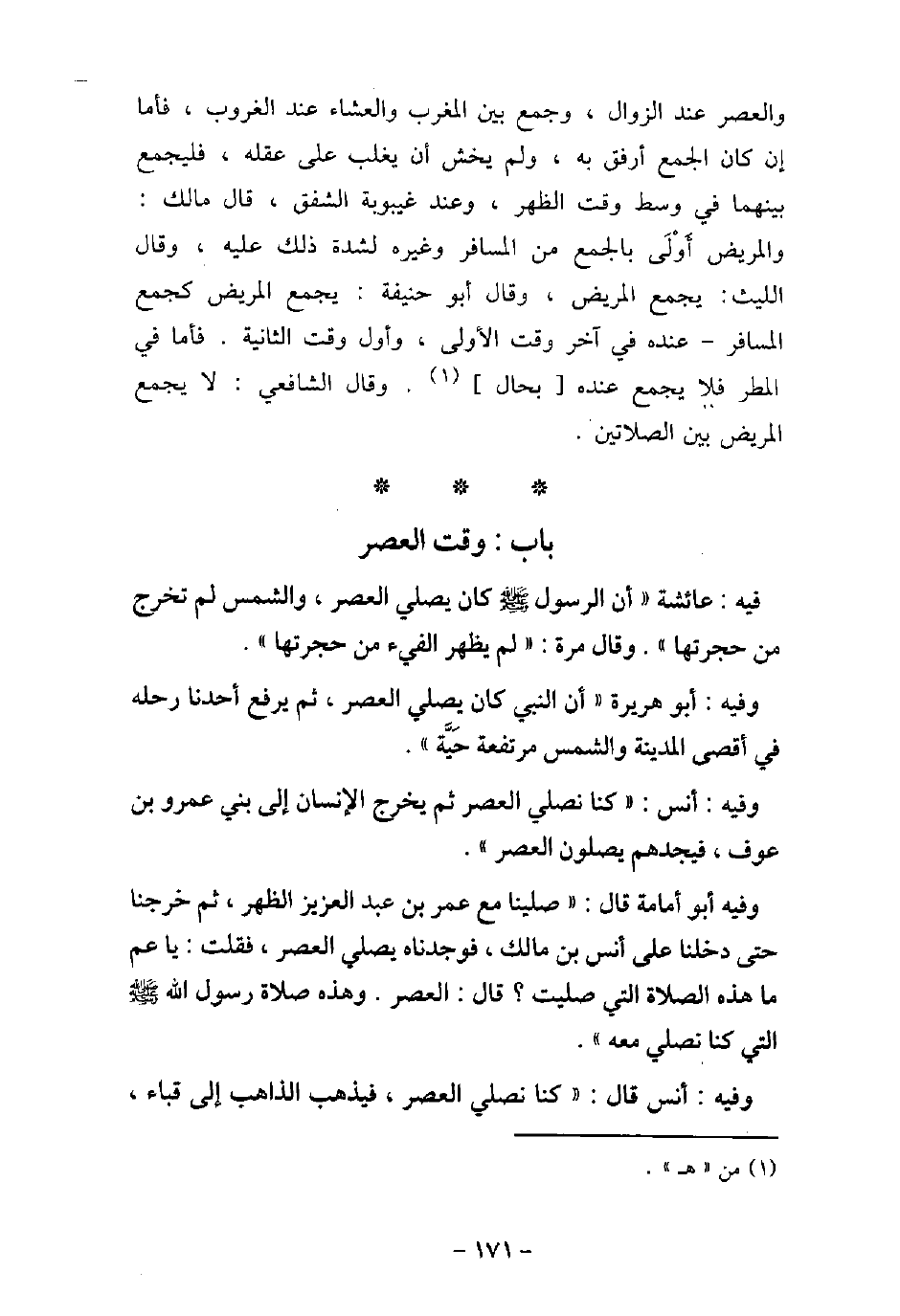 / 17 - فيه: عَائِشَةَ: (أَنَ الرَسُولُ (صلى الله عليه وسلم) كَانَ يُصَلِّي الْعَصْرَ، وَالشَّمْسُ لَمْ تَخْرُجْ مِنْ حُجْرَتِهَا) . / 18 - وقال مرة: (لَمْ يَظْهَرِ الْفَيْءُ مِنْ حُجْرَتِهَا) . / 19 - وفيه: أبو هريرة: (أنَ النَّبِيُّ كان يُصَلِّي صَلاةَ الْعَصْرِ، ثُمَّ يَرْفِعُ أَحَدُنَا إِلَى رَحْلِهِ فِي أَقْصَى الْمَدِينَةِ، وَالشَّمْسُ مرتفعة حَيَّةٌ) . / 20 - وفيه: أَنَسِ: (كُنَّا نُصَلِّي الْعَصْرَ، ثُمَّ يَخْرُجُ الإنْسَانُ إِلَى بَنِي عَمْرِو بْنِ عَوْفٍ، فَنَجِدُهُمْ يُصَلُّونَ الْعَصْرَ) . / 21 - وفيه: أبو أمامة قال: (صَلَّيْنَا مَعَ عُمَرَ بْنِ عَبْدِالْعَزِيزِ الظُّهْرَ، ثُمَّ خَرَجْنَا، حَتَّى دَخَلْنَا عَلَى أَنَسِ بْنِ مَالِكٍ، فَوَجَدْنَاهُ يُصَلِّي الْعَصْرَ، فَقُلْتُ: يَا عَمِّ مَا هَذِهِ الصَّلاةُ الَّتِي صَلَّيْتَ؟ قَالَ: الْعَصْرُ، وَهَذِهِ صَلاةُ رَسُولِ اللَّهِ (صلى الله عليه وسلم) الَّتِي كُنَّا نُصَلِّي مَعَهُ) . / 22 - وفيه: أنس قال: (كُنَّا نُصَلِّي الْعَصْرَ، فيَذْهَبُ الذَّاهِبُ إِلَى قُبَاءٍ،