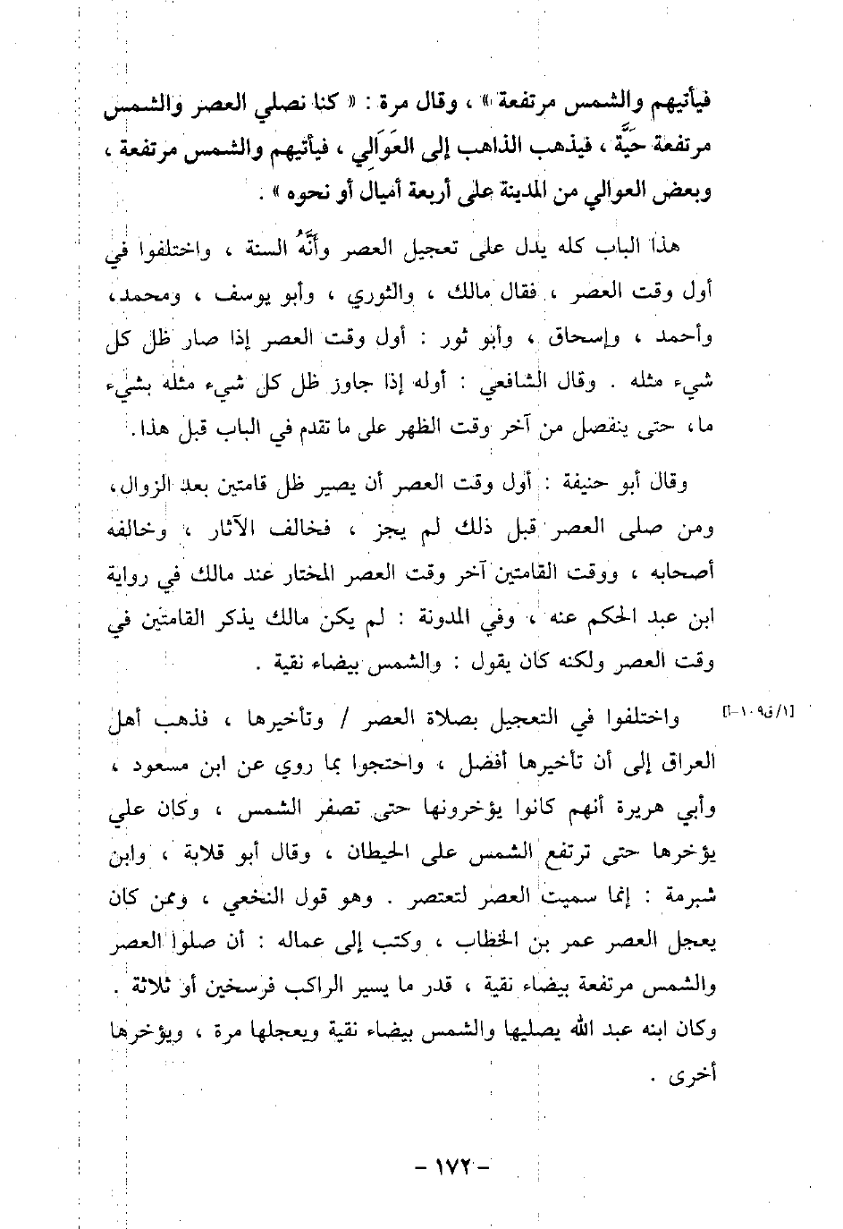 فَيَأْتِيهِمْ وَالشَّمْسُ مُرْتَفِعَةٌ) . / 23 - وقال مرة:: (كَنا نُصَلِّي الْعَصْرَ، وَالشَّمْسُ مُرْتَفِعَةٌ حَيَّةٌ، فَيَذْهَبُ الذَّاهِبُ إِلَى الْعَوَالِي، فَيَأْتِيهِمْ وَالشَّمْسُ مُرْتَفِعَةٌ، وَبَعْضُ الْعَوَالِي مِنَ الْمَدِينَةِ عَلَى أَرْبَعَةِ أَمْيَالٍ، أَوْ نَحْوِهِ) . هذا الباب كله يدل على تعجيل العصر وأنه السنة، واختلفوا فى أول وقت العصر، فقال مالك، والثورى، وأبو يوسف، ومحمد، وأحمد، وإسحاق، وأبو ثور: أول وقت العصر إذا صار ظل كل شىء مثله، وقال الشافعى: أوله إذا جاوز ظل كل شىء مثله بشىء ما، حتى ينفصل من آخر وقت الظهر على ما تقدم فى الباب قبل هذا. وقال أبو حنيفة: أول وقت العصر أن يصير ظل قامتين بعد الزوال، ومن صلى العصر قبل ذلك لم يجز، فخالف الآثار، وخالفه أصحابه، ووقت القامتين آخر وقت العصر المختار عند مالك فى رواية ابن عبد الحكم عنه، وفى المدونة: لم يكن مالك يذكر القامتين فى وقت العصر ولكنه كان يقول: والشمس بيضاء نقية. واختلفوا فى التعجيل بصلاة العصر وتأخيرها، فذهب أهل العراق إلى أن تأخيرها أفضل، واحتجوا بما روى عن ابن مسعود، وأبى هريرة أنهم كانوا يؤخرونها حتى تصفر الشمس، وكان على يؤخرها حتى ترتفع الشمس على الحيطان، وقال أبو قلابة، وابن شبرمة: إنما سميت العصر لتعتصر، وهو قول النخعى، وممن كان يعجل العصر عمر بن الخطاب، وكتب إلى عماله: أن صلوا العصر والشمس مرتفعة بيضاء نقية، قدر ما يسير الراكب فرسخين أو ثلاثة، وكان ابنه عبد الله يصليها والشمس بيضاء نقية ويعجلها مرة، ويؤخرها أخرى.