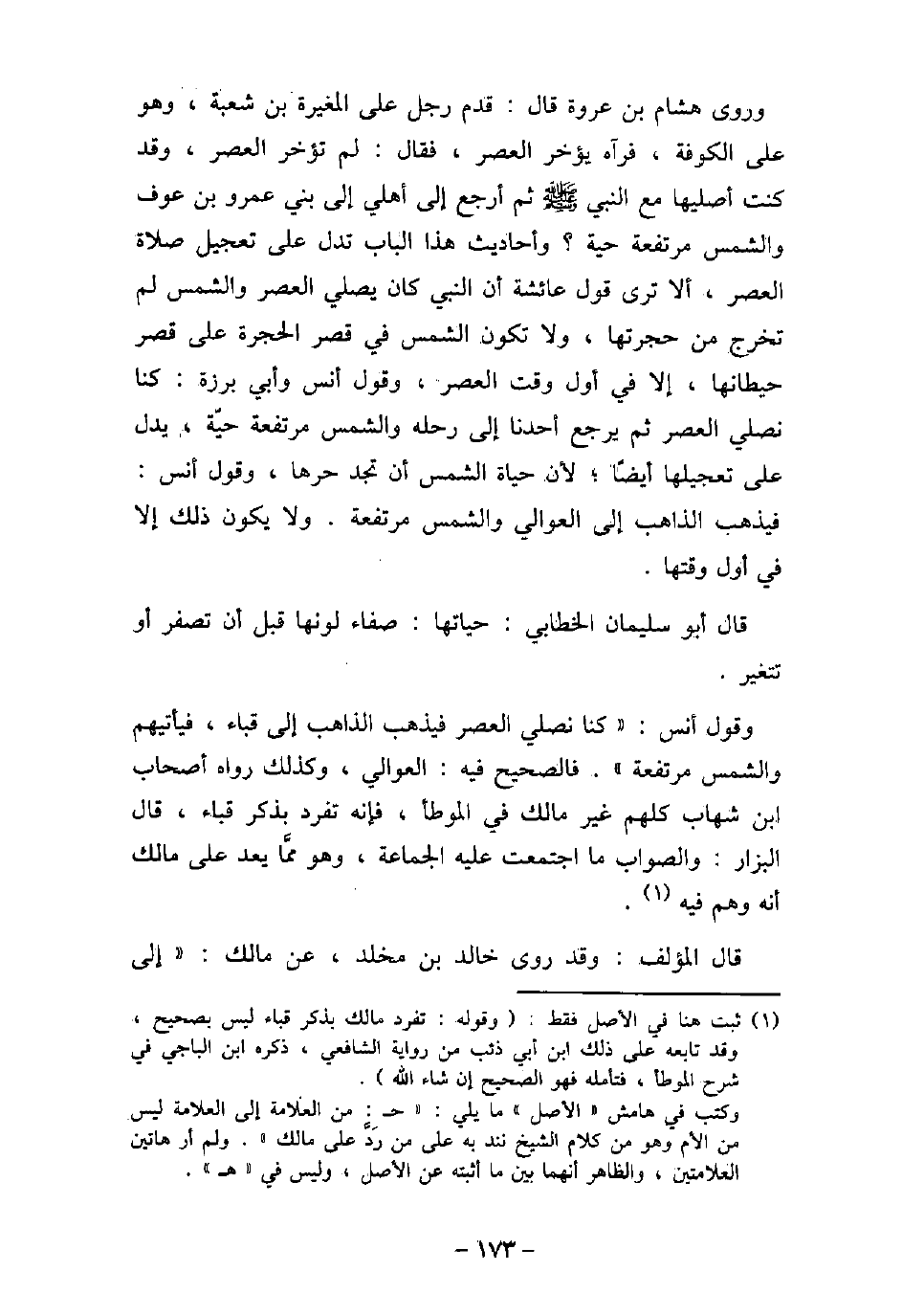 وروى هشام بن عروة قال: قدم رجل على المغيرة بن شعبة، وهو على الكوفة، فرآه يؤخر العصر، فقال: لم تؤخر العصر، وقد كنت أصليها مع النبى (صلى الله عليه وسلم) ثم أرجع إلى أهلى إلى بنى عمرو بن عوف والشمس مرتفعة حيّة؟ وأحاديث هذا الباب تدل على تعجيل صلاة العصر، ألا ترى قول عائشة أن النبى كان يصلى العصر والشمس لم تخرج من حجرتها، ولا تكون الشمس فى قصر الحجرة على قصر حيطانها، إلا فى أول وقت العصر، وقول أنس، وأبى برزة: كنا نصلى العصر، ثم يرجع أحدنا إلى رحله والشمس مرتفعة حيّة، يدل على تعجيلها أيضًا؛ لأن حياة الشمس أن تجد حرها، وقول أنس: فيذهب الذاهب إلى العوالى والشمس مرتفعة، ولا يكون ذلك إلا فى أول وقتها. قال أبو سليمان الخطابى: حياتها: صفاء لونها قبل أن تصفر أو تتغير. وقول أنس: (كنا نصلى العصر فيذهب الذاهب إلى قباء، فيأتيهم والشمس مرتفعة) ، فالصحيح فيه: العوالى، وكذلك رواه أصحاب ابن شهاب كلهم غير مالك فى الموطأ، فإنه تفرد بذكر قباء، قال البزار: والصواب ما اجتمعت عليه الجماعة، وهو ممَّا يعد على مالك أنه وهم فيه. قال المؤلف: وقد روى خالد بن مخلد، عن مالك: (إلى