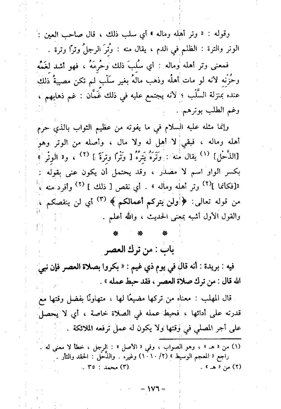 وقوله: (وتر أهله وماله) أى سلب ذلك، قال صاحب (العين) : الوتر والترة: الظلم فى الدم، يقال منه: وُتِرَ الرجلُ وترًا وترة. فمعنى وتر أهله وماله: أى سُلب ذلك وحُرِمَهُ، فهو أشد لغمه وحُزنه؛ لأنه لو مات أهله وذهب مالُه بغير سلبٍ لم تكن مصيبةُ ذلك عنده بمنزلة السَّلب؛ لأنه يجتمع عليه فى ذلك غَمَّان: غم ذهابهم، وغم الطلب بوترهم. وإنما مثله عليه السلام فى ما يفوته من عظيم الثواب بالذى حرم أهله وماله، فبقى لا أهل له ولا مال، وأصله من الوتر وهو الذَّحْل، يقال منه: وَتَرَهُ يَتِرُهُ وَتْرًا وتِرَةً، و (الوِتْر) بكسر الواو اسم لا مصدر، وقد يحتمل أن يكون عنى بقوله: (فكأنما وتر أهله وماله) ، أى نقص ذلك وأفرد منه، من قوله تعالى: (ولن يتركم أعمالكم) [محمد: 35] ، أى لن ينقصكم، والقول الأول أشبه بمعنى الحديث، والله أعلم.