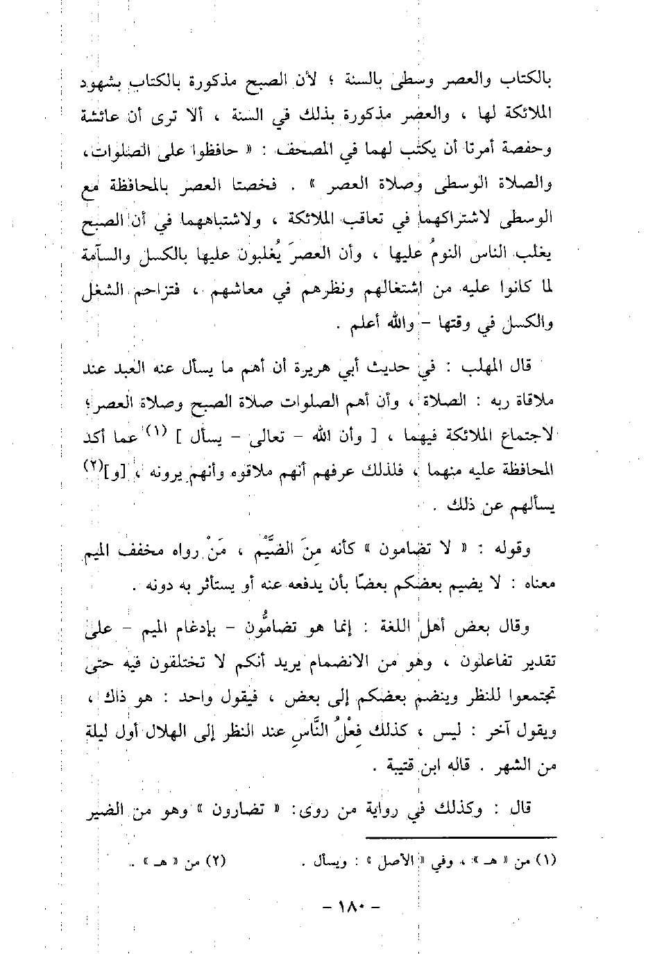 بالكتاب والعصر وسطى بالسنة؛ لأن الصبح مذكورة بالكتاب بشهود الملائكة لها، والعصر مذكورة بذلك فى السنة، ألا ترى أن عائشة وحفصة أمرتا أن يكتب لهما فى المصحف: (حافظوا على الصلوات، والصلاة الوسطى وصلاة العصر) ، فخصتا العصر بالمحافظة مع الوسطى لاشتراكهما فى تعاقب الملائكة، ولاشتباههما فى أن الصبح يغلب الناس النومُ عليها، وأن العصر يُغلبون عليها بالكسل والسآمة لما كانوا عليه من اشتغالهم ونظرهم فى معاشهم، فتزاحم الشغل والكسل فى وقتها، والله أعلم. قال المهلب: فى حديث أبى هريرة أن أهم ما يسأل عنه العبد عند ملاقاة ربه: الصلاة، وأن أهم الصلوات صلاة الصبح وصلاة العصر؛ لاجتماع الملائكة فيهما، وأن الله تعالى، يسأل عما أكد المحافظة عليه منهما، فلذلك عرفهم أنهم ملاقوه وأنهم يرونه، ويسألهم عن ذلك. وقوله: (لا تضامون) كأنه من الضيم، من رواه مخفف الميم معناه: لا يضيم بعضكم بعضًا بأن يدفعه عنه أو يستأثر به دونه. وقال بعض أهل اللغة: إنما هو تضامون، بإدغام الميم، على تقدير تفاعلون، وهو من الانضمام يريد أنكم لا تختلفون فيه حتى تجتمعوا للنظر وينضم بعضكم إلى بعض، فيقول واحد: هو ذاك، ويقول آخر: ليس، كذلك فِعلُ الناس عند النظر إلى الهلال أول ليلة من الشهر، قاله ابن قتيبة. قال: وكذلك فى رواية من روى: (تضارون) ، وهو من الضير