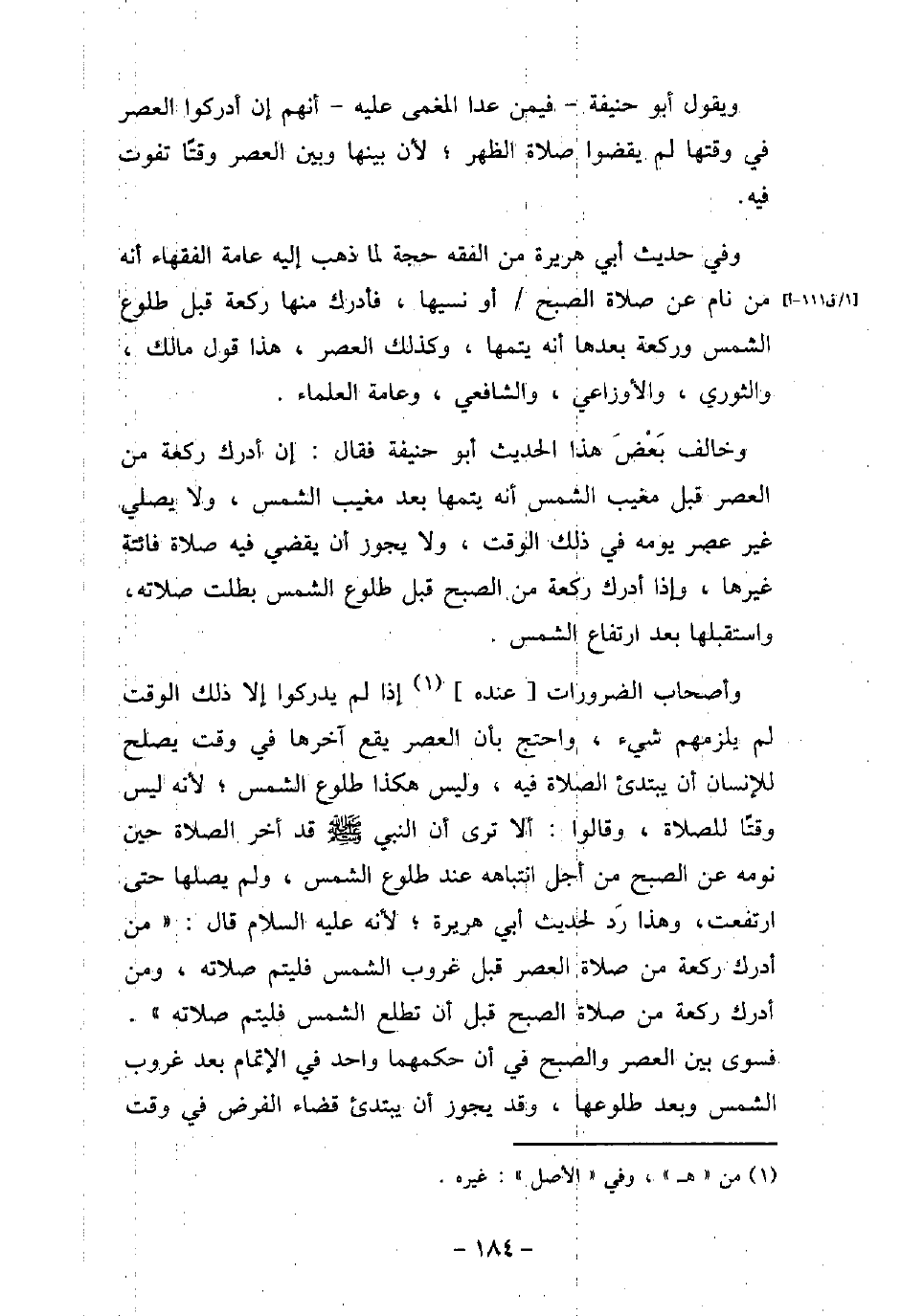 ويقول أبو حنيفة، فيمن عدا المغمى عليه، أنهم إن أدركوا العصر فى وقتها لم يقضوا صلاة الظهر؛ لأن بينها وبين العصر وقتًا تفوت فيه. وفى حديث أبى هريرة من الفقه حجة لما ذهب إليه عامة الفقهاء أنه من نام عن صلاة الصبح أو نسيها، فأدرك منها ركعة قبل طلوع الشمس وركعة بعدها أنه يتمها، وكذلك العصر، هذا قول مالك، والثورى، والأوزاعى، والشافعى، وعامة العلماء. وخالف بعض هذا الحديث أبو حنيفة فقال: إن أدرك ركعة من العصر قبل مغيب الشمس أنه يتمها بعد مغيب الشمس، ولا يصلى غير عصر يومه فى ذلك الوقت، ولا يجوز أن يقضى فيه صلاة فائتة غيرها، وإذا أدرك ركعة من الصبح قبل طلوع الشمس بطلت صلاته، واسقبلها بعد ارتفاع الشمس. وأصحاب الضرورات عنده إذا لم يدركوا إلا ذلك الوقت لم يلزمهم شىء، واحتج بأن العصر يقع آخرها فى وقت يصلح للإنسان أن يبتدئ الصلاة فيه، وليس هكذا طلوع الشمس؛ لأنه ليس وقتًا للصلاة، وقالوا: ألا ترى أن النبى (صلى الله عليه وسلم) قد أخر الصلاة حين نومه عن الصبح من أجل انتباهه عند طلوع الشمس، ولم يصلها حتى ارتفعت، وهذا رد لحديث أبى هريرة؛ لأنه عليه السلام قال: (من أدرك ركعة من صلاة العصر قبل غروب الشمس فليتم صلاته، ومن أدرك ركعة من صلاة الصبح قبل أن تطلع الشمس فليتم صلاته) ، فسوى بين العصر والصبح فى أن حكمهما واحد فى الإتمام بعد غروب الشمس وبعد طلوعها، وقد يجوز أن يبتدئ قضاء الفرض فى وقت
