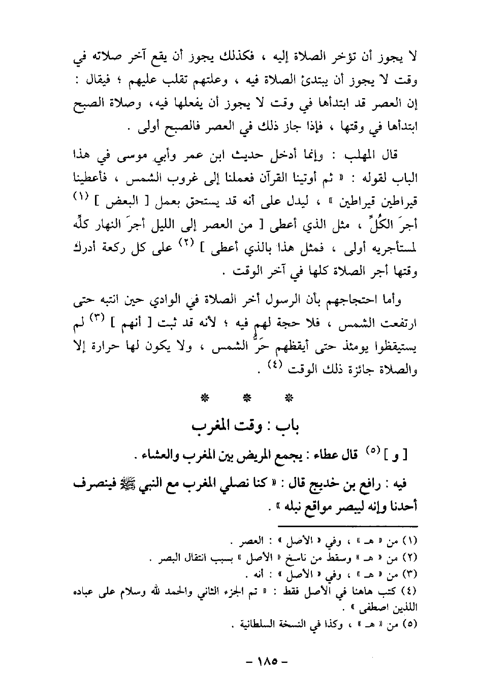 لا يجوز أن تؤخر الصلاة إليه، فكذلك يجوز أن يقع آخر صلاته فى وقت لا يجوز أن يبتدئ الصلاة فيه، وعلتهم تقلب عليهم؛ فيقال: إن العصر قد ابتدأها فى وقت لا يجوز أن يفعلها فيه، وصلاة الصبح ابتدأها فى وقتها، فإذا جاز ذلك فى العصر فالصبح أولى. قال المهلب: وإنما أدخل حديث ابن عمر وأبى موسى فى هذا الباب بقوله: (ثم أوتينا القرآن فعملنا إلى غروب الشمس، فأعطينا قيراطين قيراطين) ، ليدل على أنه قد يستحق بعمل البعض أجر الكل، مثل الذى أعطى من العصر إلى الليل أجر النهار كله لمستأجريه أولى، فمثل هذا الذى أعطى على كل ركعة أدرك وقتها أجر الصلاة كلها فى آخر الوقت. وأما احتجاجهم بأن الرسول أخر الصلاة فى الوادى حين انتبه حتى ارتفعت الشمس، فلا حجة لهم فيه؛ لأنه قد ثبت أنهم لم يستيقظوا يومئذ حتى أيقظهم حر الشمس، ولا يكون لها حرارة إلا والصلاة جائزة ذلك الوقت.