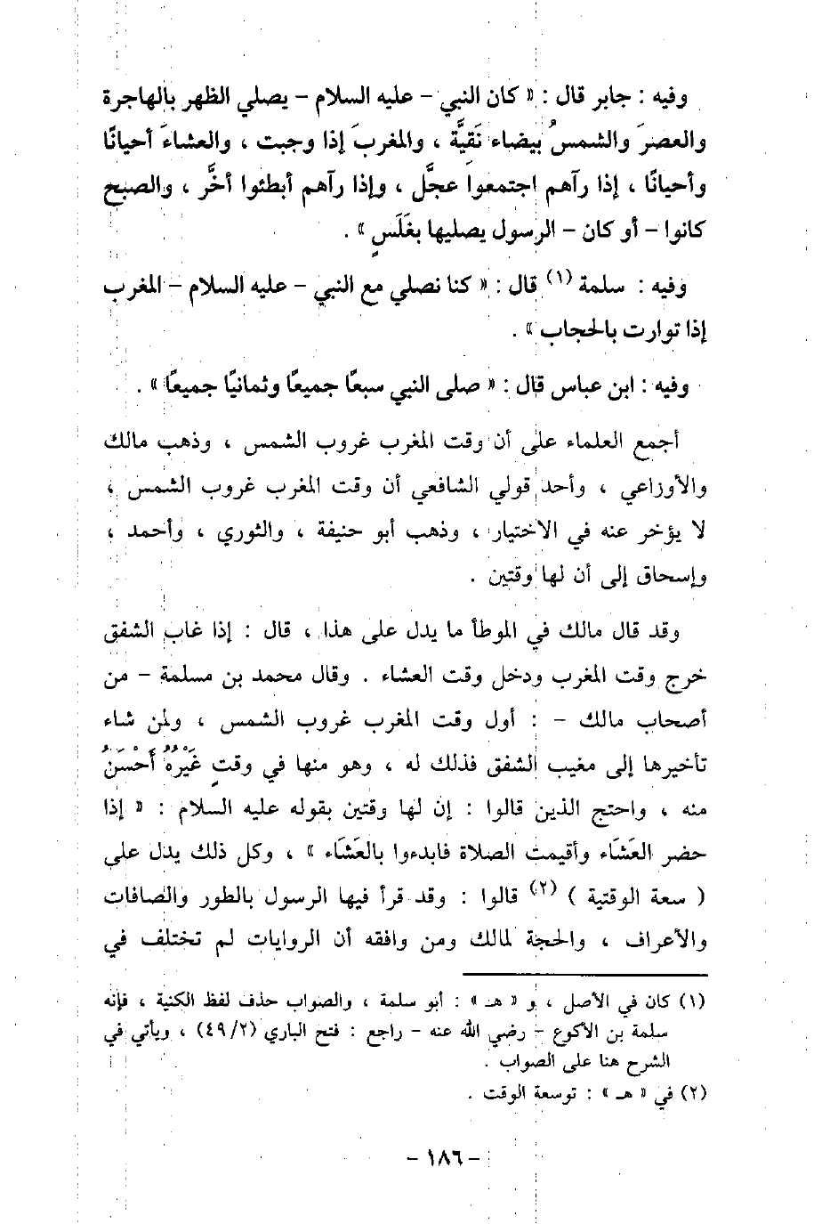 / 32 - وفيه: جَابِرَ قَالَ: (كَانَ النَّبِيُّ (صلى الله عليه وسلم) يُصَلِّي الظُّهْرَ بِالْهَاجِرَةِ، وَالْعَصْرَ وَالشَّمْسُ بيضاء نَقِيَّةٌ، وَالْمَغْرِبَ إِذَا وَجَبَتْ، وَالْعِشَاءَ أَحْيَانًا، وَأَحْيَانًا إِذَا رَآهُمُ اجْتَمَعُوا عَجَّلَ، وَإِذَا رَآهُمْ أَبْطَئوْا أَخَّرَ، وَالصُّبْحَ كَانُوا أَوْ كَانَ الرسول يُصَلِّيهَا بِغَلَسٍ) . / 33 - وفيه: سَلَمَةَ قَالَ: (كُنَّا نُصَلِّي مَعَ النَّبِيِّ (صلى الله عليه وسلم) الْمَغْرِبَ إِذَا تَوَارَتْ بِالْحِجَابِ) . / 34 - وفيه: ابْنِ عَبَّاسٍ قَالَ: (صَلَّى النَّبِيُّ سَبْعًا جَمِيعًا، وَثَمَانِيًا جَمِيعًا) . أجمع العلماء على أن وقت المغرب غروب الشمس، وذهب مالك والأوزاعى، وأحد قولى الشافعى أن وقت المغرب غروب الشمس، لا يؤخر عنه فى الاختيار، وذهب أبو حنيفة، والثورى، وأحمد، وإسحاق إلى أن لها وقتين. وقد قال مالك فى الموطأ ما يدل على هذا، قال: إذا غاب الشفق خرج وقت المغرب ودخل وقت العشاء، وقال محمد بن مسلمة، من أصحاب مالك: أول وقت المغرب غروب الشمس، ولمن شاء تأخيرها إلى مغيب الشفق فذلك له، وهو منها فى وقت غيرُهُ أحسنُ منه، واحتج الذين قالوا: إن لها وقتين بقوله عليه السلام: (إذا حضر العشاء وأقيمت الصلاة فابدوا بالعشاء) ، وكل ذلك يدل على سعة الوقتية قالوا: وقد قرأ فيها الرسول بالطور، والصافات، والأعراف، والحجة لمالك ومن وافقه أن الروايات لم تختلف فى
