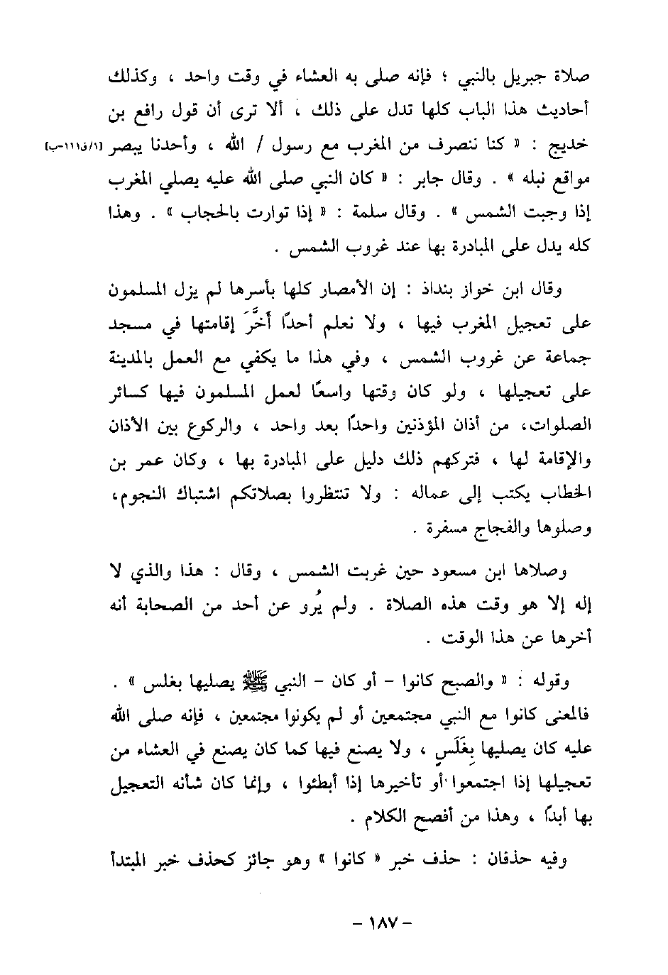 صلاة جبريل بالنبى؛ فإنه صلى به العشاء فى وقت واحد، وكذلك أحاديث هذا الباب كلها تدل على ذلك، ألا ترى أن قول رافع بن خديج: (كنا ننصرف من المغرب مع رسول الله، وأحدنا يبصر مواقع نبله) ، وقال جابر: (كان النبى (صلى الله عليه وسلم) يصلى المغرب إذا وجبت الشمس) ، وقال سلمة: (إذا توارت بالحجاب) ، وهذا كله يدل على المبادرة بها عند غروب الشمس. وقال ابن خواز بنداذ: إن الأمصار كلها بأسرها لم يزل المسلمون على تعجيل المغرب فيها، ولا نعلم أحدًا أَخَّرَ إقامتها فى مسجد جماعة عن غروب الشمس، وفى هذا ما يكفى مع العمل بالمدينة على تعجيلها، ولو كان وقتها واسعًا لعمل المسلمون فيها كسائر الصلوات، من أذان المؤذنين واحدًا بعد واحد، والركوع بين الأذان والإقامة لها، فتركهم ذلك دليل على المبادرة بها، وكان عمر بن الخطاب يكتب إلى عماله: ولا تنتظروا بصلاتكم اشتباك النجوم، وصلوها والفجاج مسفرة. وصلاها ابن مسعود حين غربت الشمس، وقال: هذا والذى لا إله إلا هو وقت هذه الصلاة، ولم يرو عن أحد من الصحابة أنه أخر عن هذا الوقت. وقوله: (والصبح كانوا، أو كان النبى (صلى الله عليه وسلم) يصليها بغلس) ، فالمعنى كانوا مع النبى مجتمعين أو لم يكونوا مجتمعين، فإنه (صلى الله عليه وسلم) كان يصليها بغلسٍ، ولا يصنع فيها كما كان يصنع فى العشاء من تعجيلها إذا اجتمعوا أو تأخيرها إذا أبطئوا، وإنما كان شأنه التعجيل بها أبدًا، وهذا من أفصح الكلام. وفيه حذفان: حذف الخبر (كانوا) وهو جائز كحذف خبر المبتدأ