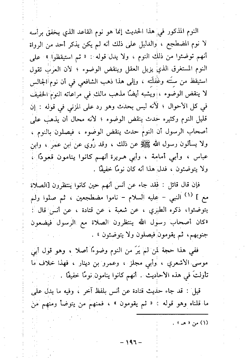 النوم المذكور فى هذا الحديث إنما هو نوم القاعد الذى يخفق برأسه لا نوم المضطحع، والدليل على ذلك أنه لم يكن يذكر أحد من الرواة أنهم توضئوا من ذلك النوم، ولا يدل قوله: (ثم استيقظوا) على النوم المستغرق الذى يزيل العقل وينقض الوضوء؛ لأن العرب تقول: استيقظ من سنَتِه وغفلَتِه، وإلى هذا ذهب الشافعى فى أن نوم الجالس لا ينقض الوضوء، ويشبه أيضًا مذهب مالك فى مراعاته النوم الخفيف فى كل الأحوال؛ لأنه ليس بحدث وهو رد على المزنى فى قوله: إن قليل النوم وكثيره حدث ينقض الوضوء؛ لأنه محال أن يذهب على أصحاب الرسول أن النوم حدث ينقض الوضوء، فيصلون بالنوم، ولا يسألون رسول الله (صلى الله عليه وسلم) عن ذلك، وقد رُوى عن ابن عمر، وابن عباس، وأبى أمامة، وأبى هريرة أنهم كانوا ينامون قعودًا، ولا يتوضئون، فدل هذا أنه كان نومًا خفيفًا. فإن قال قائل: فقد جاء عن أنس أنهم حين كانوا ينتظرون الصلاة مع النبى، عليه السلام، ناموا مضطجعين، ثم صلوا ولم يتوضئوا، ذكره الطبرى، عن شعبة، عن قتادة، عن أنس، قال: (كان أصحاب رسول الله ينتظرون الصلاة مع الرسول فيضعون جنوبهم، ثم يقمون فيصلون ولا يتوضئون) . ففى هذا حجة لمن لم ير من النوم وضوءًا أصلاً، وهو قول أبى موسى الأشعرى، وأبى مجلز، وعمرو بن دينار، فهذا خلاف ما تأولت فى هذه الأحاديث، أنهم كانوا ينامون نومًا خفيفًا. قيل: قد جاء حديث قتادة، عن أنس بلفظ آخر، وفيه ما يدل على ما قلناه وهو قوله: (ثم يقومون) ، فمنهم من يتوضأ ومنهم من