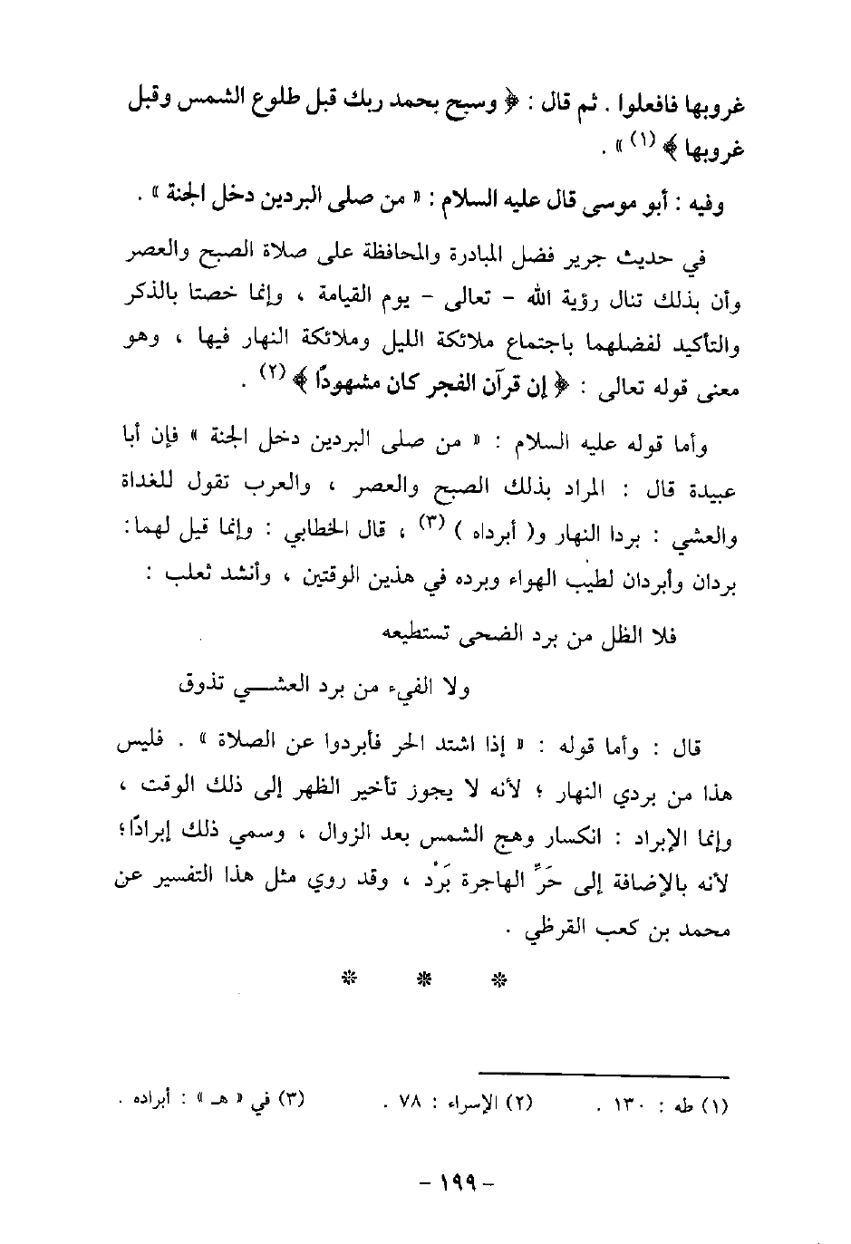 غُرُوبِهَا، فَافْعَلُوا، ثُمَّ قَالَ: (وسَبِّحْ بِحَمْدِ رَبِّكَ قَبْلَ طُلُوعِ الشَّمْسِ وَقَبْلَ غُرُوبِهَا) [طه: 130] . / 46 - وفيه: أَبو مُوسَى، قال عليه السلام: (مَنْ صَلَّى الْبَرْدَيْنِ، دَخَلَ الْجَنَّةَ) . فى حديث جرير فضل المبادرة والمحافظة على صلاة الصبح والعصر، وأن بذلك تناول رؤية الله تعالى، يوم القيامة، وإنما خصتا بالذكر والتأكيد لفضلهما باجتماع ملائكة الليل، وملائكة النهار فيها، وهو معنى قوله تعالى: (إن قرآن الفجر كان مشهودًا) [الإسراء: 78] . وأما قوله عليه السلام: (من صلى البردين دخل الجنة) ، فإن أبا عبيدة قال: المراد بذلك الصبح والعصر، والعرب تقول للغداة والعشى: بردا النهار وأبرداه، قال الخطابى: وإنما قيل لهما: بردان، وأبردان لطيب الهواء، وبرده فى هذين الوقتين، وأنشد ثعلب: فلا الظل من برد الضحى تستطيعه ولا الفىء من برد العشى تذوق قال: وأما قوله: (إذا اشتد الحر، فأبردوا عن الصلاة) ، فليس هذا من بردى النهار؛ لأنه لا يجوز تأخير الظهر إلى ذلك الوقت، وإنما الإبراد: انكسار وهج الشمس بعد الزوال، وسمى ذلك إبرادًا؛ لأنه بالإضافة إلى حَرِّ الهاجرة برد، وقد روى مثل هذا التفسير عن محمد بن كعب القرظى.