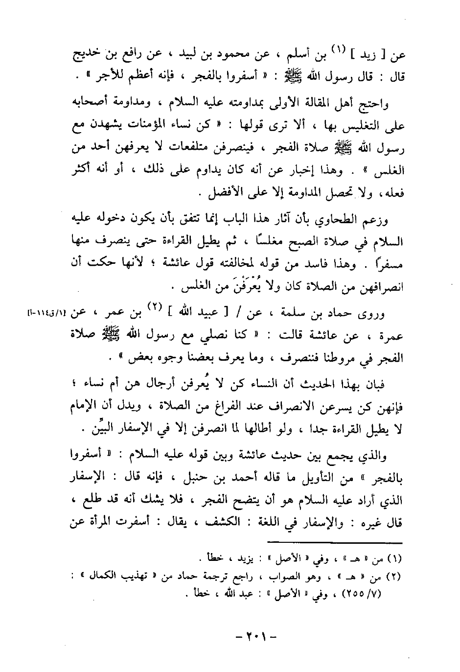 عن زيد بن أسلم، عن محمود بن لبيد، عن رافع بن خديج قال: قال رسول الله (صلى الله عليه وسلم) : (أسفروا بالفجر، فإنه أعظم للأجر) . واحتج أهل المقالة الأولى بمداومته عليه السلام، ومداومة أصحابه على التغليس بها، ألا ترى قولها: (كن نساء المؤمنات يشهدن مع رسول الله (صلى الله عليه وسلم) صلاة الفجر، فينصرفن متلفعات لا يعرفهن أحد من الغلس) ، وهذا إخبار عن أنه كان يداوم على ذلك، أو أنه أكثر فعله، ولا تحصل المداومة إلا على الأفضل. وزعم الطحاوى بأن آثار هذا الباب إنما تتفق بأن يكون دخوله عليه السلام، فى صلاة الصبح مغلسًا، ثم يطيل القراءة حتى ينصرف منها مسفرًا، وهذا فاسد من قوله لمخالفته قول عائشة؛ لأنها حكت أن انصرافهن من الصلاة كان ولا يُعْرَفْنَ من الغلس. وروى حماد بن سلمة، عن عبيد الله بن عمر، عن عمرة، عن عائشة قالت: (كنا نصلى مع رسول الله (صلى الله عليه وسلم) صلاة الفجر فى مروطنا فننصرف، وما يعرف بعضنا وجوه بعض) . فبان بهذا الحديث أن النساء كن لا يُعرفن أرجال هن أم نساء؛ فإنهن كن يسرعن الانصراف عند الفراغ من الصلاة، ويدل أن الإمام لا يطيل القراءة جدًا، ولو أطالها لما انصرفن إلا فى الإسفار البيِّن. والذى يجمع بين حديث عائشة وبين قوله عليه السلام: (أسفروا بالفجر) من التأويل ما قاله أحمد بن حنبل، فإنه قال: الإسفار الذى أراد عليه السلام، هو أن يتضح الفجر، فلا يشك أنه قد طلع، قال غيره: والإسفار فى اللغة: الكشف، يقال: أسفرت المرأة عن