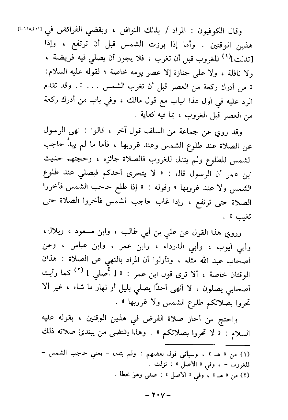 وقال الكوفيون: المراد بذلك النوافل، ويقضى الفرائض فى هذين الوقتين، وأما إذا برزت الشمس قبل أن ترتفع، وإذا تدلت للغروب قبل أن تغرب، فلا يجوز أن يصلى فيه فريضة، ولا نافلة، ولا على جنازة إلا عصر يومه خاصة؛ لقوله عليه السلام: (من أدرك ركعة من العصر قبل أن تغرب الشمس. . .) ، وقد تقدم الرد عليه فى أول هذا الباب مع قول مالك، وفى باب من أدرك ركعة من العصر قبل المغرب، بما فيه كفاية. وقد روى عن جماعة من السلف قول آخر، قالوا: نهى الرسول عن الصلاة عند طلوع الشمس وعند غروبها، فأما ما لم يبدُ حاجب الشمس للطلوع ولم يتدل للغروب فالصلاة جائزة، وحجتهم حديث ابن عمر أن الرسول قال: (لا يتحرى أحدكم فيصلى عند طلوع الشمس ولا عند غروبها) ، وقوله: (إذا طلع حاجب الشمس فأخروا الصلاة حتى ترتفع، وإذا غاب حاجب الشمس فأخروا الصلاة حتى تغيب) . وروى هذا القول عن على بن أبى طالب، وابن مسعود، وبلال، وأبى أيوب، وأبى الدرداء، وابن عمر، وابن عباس، وعن أصحاب عبد الله مثله، وتأولوا أن المراد بالنهى عن الصلاة: هذان الوقتان خاصة، ألا ترى قول ابن عمر: (أُصلى كما رأيت أصحابى يصلون، لا أنهى أحدًا يصلى بليل أو نهار ما شاء، غير ألا تحروا بصلاتكم طلوع الشمس ولا غروبها) . واحتج من أجاز صلاة الفرض فى هذين الوقتين، بقوله عليه السلام: (لا تحروا بصلاتكم) ، وهذا يقتضى من يبتدئ صلاته ذلك