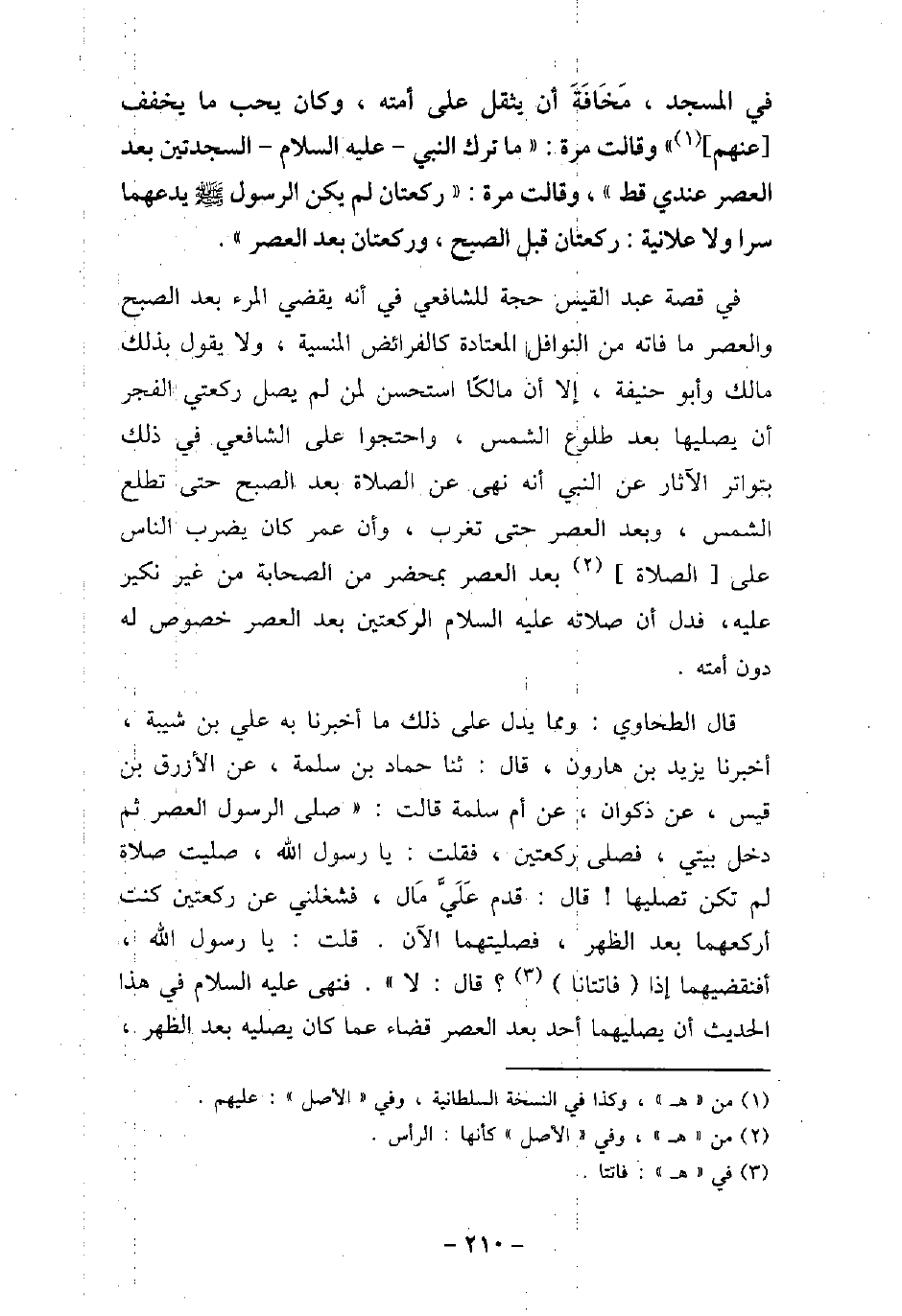 فِي الْمَسْجِدِ، مَخَافَةَ أَنْ يُثَقِّلَ عَلَى أُمَّتِهِ، وَكَانَ يُحِبُّ مَا يُخَفِّفُ عَنْهُمْ) . / 58 - وقالت مرة: (مَا تَرَكَ النَّبِيُّ عليه السلام، السَّجْدَتَيْنِ بَعْدَ الْعَصْرِ عِنْدِي قَطُّ) . / 59 - وقالت مرة: (رَكْعَتَانِ لَمْ يَكُنْ الرَسُولُ (صلى الله عليه وسلم) يَدَعُهُمَا سِرًّا وَلا عَلانِيَةً: رَكْعَتَانِ قَبْلَ الصُّبْحِ، وَرَكْعَتَانِ بَعْدَ الْعَصْرِ) . فى قصة عبد القيس، حجة للشافعى فى أنه يقضى المرء بعد الصبح والعصر ما فاته من النوافل المعتادة كالفرائض المنسية، ولا يقول بذلك مالك، وأبو حنيفة، إلا أن مالكًا استحسن لمن لم يصل ركعتى الفجر أن يصليها بعد طلوع الشمس، واحتجوا على الشافعى فى ذلك بتواتر الآثار عن النبى أنه نهى عن الصلاة بعد الصبح حتى تطلع الشمس، وبعد العصر حتى تغرب، وأن عمر كان يضرب الناس على الصلاة بعد العصر بمحضر من الصحابة من غير نكير عليه، فدل أن صلاته عليه السلام، الركعتين بعد العصر خصوص له دون أمته. قال الطحاوى: ومما يدل على ذلك ما أخبرنا به على بن شيبة، أخبرنا يزيد بن هارون، قال: ثنا حماد بن سلمة، عن الأزرق بن قيس، عن ذكوان، عن أم سلمة قالت: صلى الرسول العصر، ثم دخل بيتى، فصلى ركعتين، فقلت: يا رسول الله، صليت صلاة لم تكن تصليها قال: (قدم علىَّ مال، فشغلنى عن ركعتين كنت أركعهما بعد الظهر، فصليتهما الآن) ، قلت: يا رسول الله، أفنقضيهما إذا فاتتانا؟ قال: (لا) ، فنهى عليه السلام فى هذا الحديث أن يصليهما أحد بعد العصر قضاء عما كان يصليه بعد الظهر،