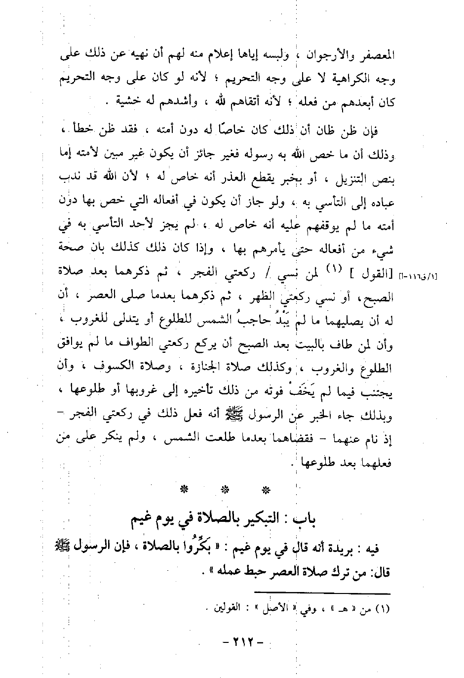 المعصفر والأرجوان، ولبسه إياها إعلام منه لهم أنه نهيه عن ذلك على وجه الكراهية لا على وجه التحريم؛ لأنه لو كان على وجه التحريم كان أبعدهم من فعله؛ لأنه أتقاهم لله، وأشدهم له خشية. فإن ظن ظان أن ذلك كان خاصًا له دون أمته، فقد ظن خطأ، وذلك أن ما خص الله به رسوله فغير جائز أن يكون غير مبين لأمته إما بنص التنزيل، أو بخبر يقطع العذر أنه خاص له؛ لأن الله قد ندب عباده إلى التأسى به، ولو جاز أن يكون فى أفعاله التى خص بها دون أمته ما لم يوقفهم عليه أنه خاص له، لم يجز لأحد التأسى به فى شىء من أفعاله حتى يأمرهم بها، وإذا كان ذلك كذلك بان صحة القول لمن نسى ركعتى الفجر، ثم ذكرهما بعد صلاة الصبح، أو نسى ركعتى الظهر، ثم ذكرهما بعدما صلى العصر، أن له أن يصليهما ما لم يبدُ حاجبُ الشمس للطلوع أو يتدلى للغروب، وأن لمن طاف بالبيت بعد الصبح أن يركع ركعتى الطواف ما لم يوافق الطلوع والغروب، وكذلك صلاة الجنازة، وصلاة الكسوف، وأن يجتنب فيما لم يخف فوته من ذلك تأخيره إلى غروبها أو طلوعها، وبذلك جاء الخبر عن الرسول (صلى الله عليه وسلم) أنه فعل ذلك فى ركعتى الفجر، إذ نام عنهما، فقضاهما بعد ما طلعت الشمس، ولم ينكر على من فعلهما بعد طلوعها.