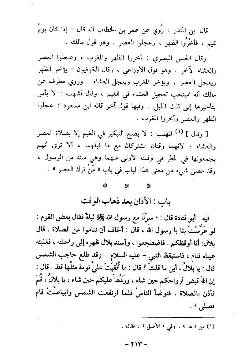 / 61 - فيه: أَبو قَتَادَةَ قَالَ: (سِرْنَا مَعَ رسول الله (صلى الله عليه وسلم) لَيْلَةً، فَقَالَ بَعْضُ الْقَوْمِ: لَوْ عَرَّسْتَ بِنَا يَا رَسُولَ اللَّهِ، قَالَ: أَخَافُ أَنْ تَنَامُوا عَنِ الصَّلاةِ، قَالَ بِلالٌ: أَنَا أُوقِظُكُمْ، فَاضْطَجَعُوا، وَأَسْنَدَ بِلالٌ ظَهْرَهُ إِلَى رَاحِلَتِهِ، فَغَلَبَتْهُ عَيْنَاهُ فَنَامَ، فَاسْتَيْقَظَ النَّبِيُّ عليه السلام، وَقَدْ طَلَعَ حَاجِبُ الشَّمْسِ، فَقَالَ: يَا بِلالُ، أَيْنَ مَا قُلْتَ؟ قَالَ: مَا أُلْقِيَتْ عَلَيَّ نَوْمَةٌ مِثْلُهَا قَطُّ، قَالَ: إِنَّ اللَّهَ قَبَضَ أَرْوَاحَكُمْ حِينَ شَاءَ، وَرَدَّهَا عَلَيْكُمْ حِينَ شَاءَ يَا بِلالُ، قُمْ فَأَذِّنْ بِالنَّاسِ بِالصَّلاةِ، فَتَوَضَّأَ النَّاسُ، فَلَمَّا ارْتَفَعَتِ الشَّمْسُ وَابْيَاضَّتْ، قَامَ فَصَلَّى) .