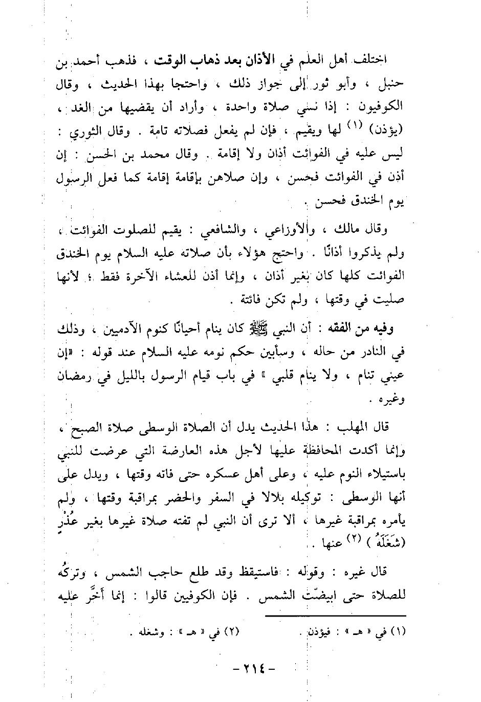 اختلف أهل العلم فى الأذان بعد ذهاب الوقت، فذهب أحمد بن حنبل، وأبو ثور إلى جواز ذلك، واحتجا بهذا الحديث، وقال الكوفيون: إذا نسى صلاة واحدة، وأراد أن يقضيها من الغد، يؤذن لها ويقيم، فإن لم يفعل فصلاته تامة، وقال الثورى: ليس عليه فى الفوائت أذان ولا إقامة، وقال محمد بن الحسن: إن أذن فى الفوائت فحسن، وإن صلاهن بإقامة إقامة كما فعل الرسول يوم الخندق فحسن. وقال مالك، والأوزاعى، والشافعى: يقيم للصلوات الفوائت، ولم يذكروا أذانًا، واحتج هؤلاء بأن صلاته عليه السلام، يوم الخندق الفوائت كلها كان بغير أذان، وإنما أذن للعشاء الآخرة فقط؛ لأنها صليت فى وقتها، ولم تكن فائتة. وفيه من الفقه: أن النبى (صلى الله عليه وسلم) كان ينام أحيانًا كنوم الآدميين، وذلك فى النادر من حاله، وسأبين حكم نومه عليه السلام، عند قوله: (إن عينى تنام، ولا ينام قلبى) ، فى باب قيام الرسول بالليل فى رمضان وغيره. قال المهلب: هذا الحديث يدل أن الصلاة الوسطى صلاة الصبح، وإنما أكدت المحافظة عليها لأجل هذه العارضة التى عرضت للنبى باستيلاء النوم عليه، وعلى أهل عسكره حتى فاته وقتها، ويدل على أنها الوسطى: توكيله بلالا فى السفر والحضر بمراقبة وقتها، ولم يأمره بمراقبة غيرها، ألا ترى أن النبى لم تفته صلاة غيرها بغير عُذرٍ شغله عنها. قال غيره: وقوله: فاستيقظ وقد طلع حاجب الشمس، وتركه للصلاة حتى ابيضّت الشمس، فإن الكوفيون قالوا: إنما أخَّر عليه