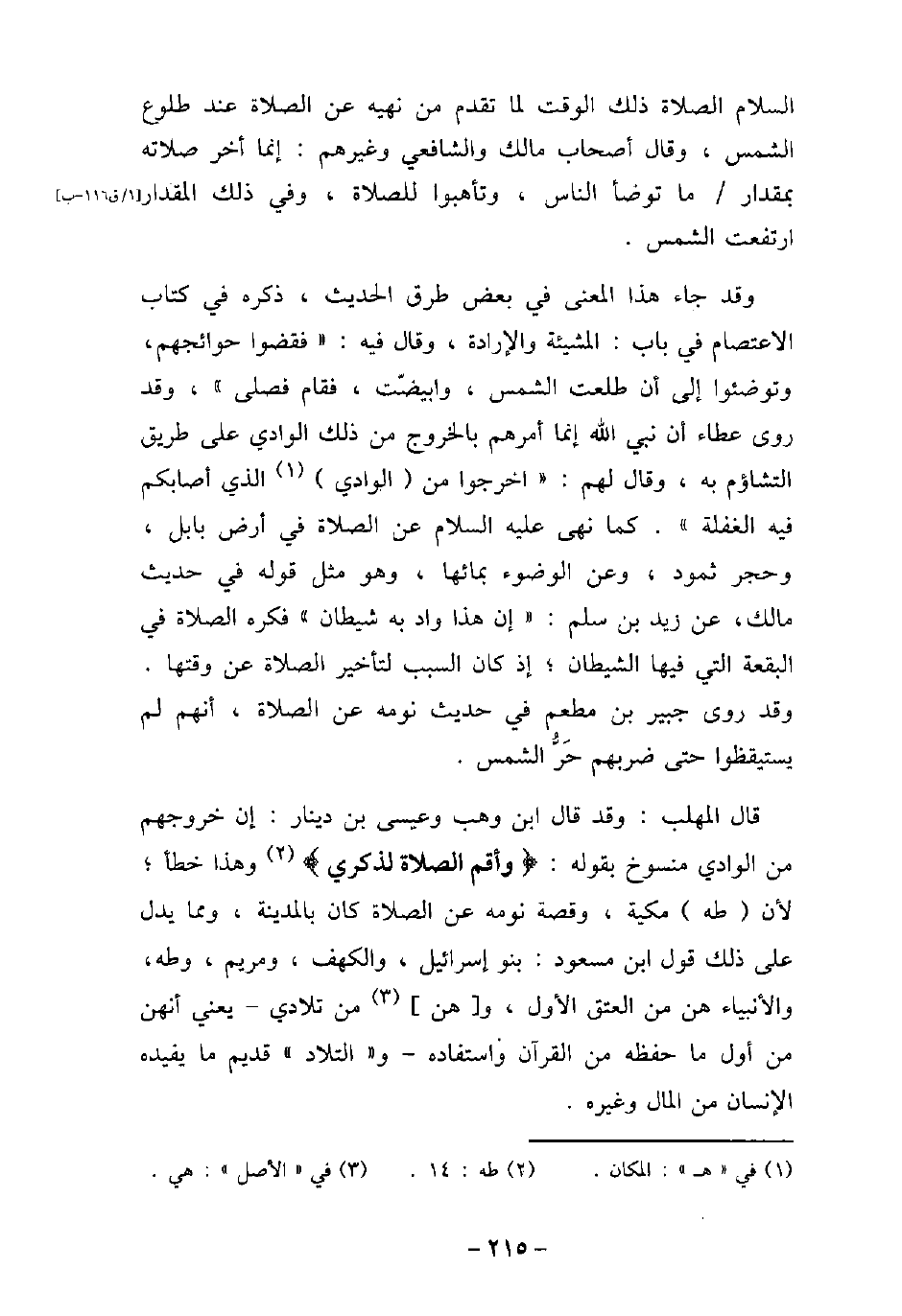 السلام، الصلاة ذلك الوقت لما تقدم من نهيه عن الصلاة عند طلوع الشمس، وقال أصحاب مالك، والشافعى وغيرهم: إنما أخر صلاته بمقدار ما توضأ الناس، وتأهبوا للصلاة، وفى ذلك المقدار ارتفعت الشمس. وقد جاء هذا المعنى فى بعض طرق الحديث، ذكره فى كتاب الاعتصام فى باب: المشيئة والإرادة، وقال فيه: (فقضوا حوائجهم، وتوضئوا إلى أن طلعت الشمس، وابيضّت، فقام فصلى) ، وقد روى عطاء أن نبى الله إنما أمرهم بالخروج من ذلك الوادى على طريق التشاؤم به، وقال لهم: (اخرجوا من الوادى الذى أصابكم فيه الغفلة) ، كما نهى عليه السلام، عن الصلاة فى أرض بابل، وحجر ثمود، وعن الوضوء بمائها، وهو مثل قوله فى حديث مالك، عن زيد بن سلم: (إن هذا واد به شيطان) ، فكره الصلاة فى البقعة التى فيها الشيطان؛ إذ كان السبب لتأخير الصلاة عن وقتها، وقد روى جبير بن مطعم فى حديث نومه عن الصلاة، أنهم لم يستيقظوا حتى ضربهم حَرُّ الشمس. قال المهلب: وقد قال ابن وهب، وعيسى بن دينار: إن خروجهم من الوادى منسوخ بقوله: (وأقم الصلاة لذكرى) [طه: 14] ، وهذا خطأ؛ لأن (طه) مكية، وقصة نومه عن الصلاة كان بالمدينة، ومما يدل على ذلك قول ابن مسعود: بنو إسرائيل، والكهف، ومريم، وطه، والأنبياء، هن من العتق الأول، وهن من تلادى، يعنى أنهن من أول ما حفظه من القرآن واستفاده، و (التلاد) قديم ما يفيده الإنسان من المال وغيره.