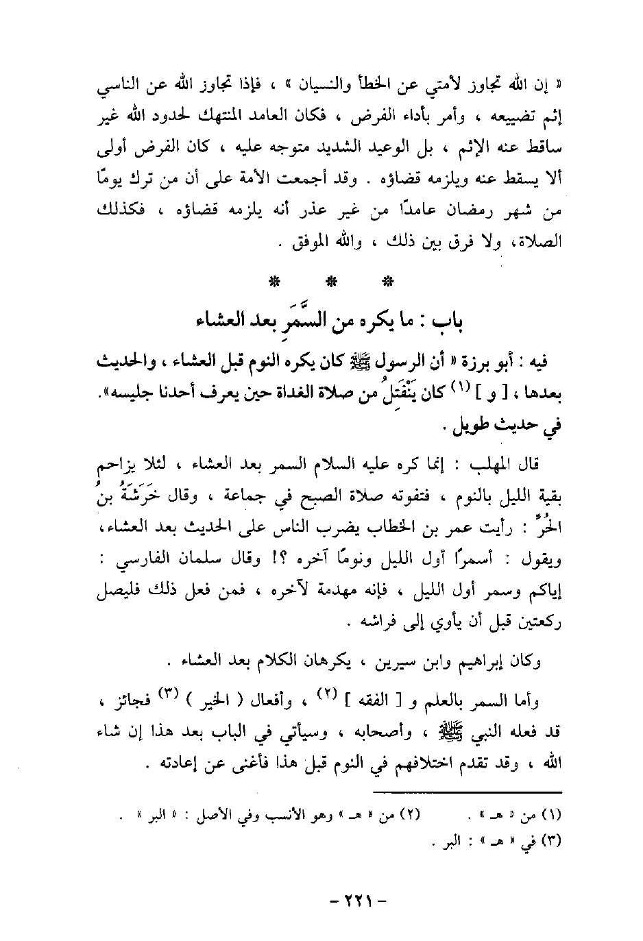 / 65 - فيه: أبو برزة: أن الرسول (صلى الله عليه وسلم) كَانَ يَكْرَهُ النَّوْمَ قَبْلَ العشاء، وَالْحَدِيثَ بَعْدَهَا، وَكَانَ يَنْفَتِلُ مِنْ صَلاةِ الْغَدَاةِ، حِينَ يَعْرِفُ أَحَدُنَا جَلِيسَهُ) ، فى حديث طويل. قال المهلب: إنما كره عليه السلام، السمر بعد العشاء، لئلا يزاحم بقية الليل بالنوم، فتفوته صلاة الصبح فى جماعة، وقال خَرَشَةُ بن الحُرِّ: رأيت عمر بن الخطاب يضرب الناس على الحديث بعد العشاء، ويقول: أسمرًا أول الليل ونومًا آخره؟ . وقال سلمان الفارسى: إياكم وسمر أول الليل، فإنه مهدمة لآخره، فمن فعل ذلك فليصل ركعتين قبل أن يأوى إلى فراشه. وكان إبراهيم، وابن سيرين، يكرهان الكلام بعد العشاء. وأما السمر بالعلم والفقه، وأفعال الخير فجائز، قد فعله النبى (صلى الله عليه وسلم) ، وأصحابه، وسيأتى فى الباب بعد هذا إن شاء الله، وقد تقدم اختلافهم فى النوم قبل هذا فأغنى عن إعادته.