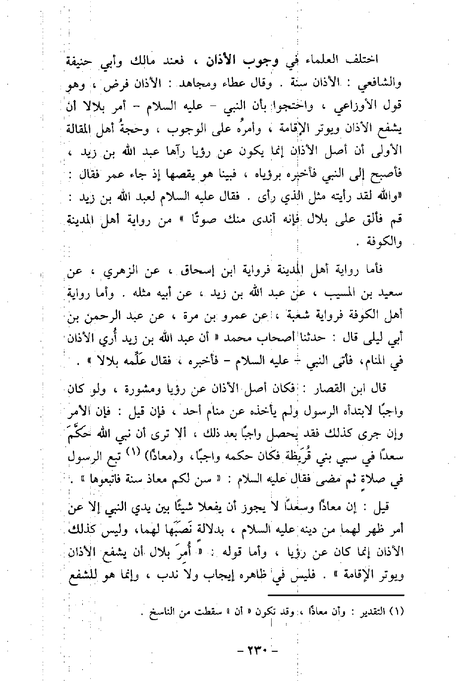اختلف العلماء فى وجوب الأذان، فعند مالك، وأبى حنيفة، والشافعى: الأذان سنة، وقال عطاء، ومجاهد: الأذان فرض، وهو قول الأوزاعى، واحتجوا بأن النبى، عليه السلام، أمر بلالاً أن يشفع الأذان ويوتر الإقامة، وأمره على الوجوب، وحجةُ أهل المقالة الأولى أن أصل الأذان إنما يكون عن رؤيا رآها عبد الله بن زيد، فأصبح إلى النبى فأخبره برؤياه، فبينا هو يقصها إذ جاء عمر فقال: والله لقد رأيته مثل الذى رأى، فقال عليه السلام لعبد الله ابن زيد: (قم فألق على بلال فإنه أندى منك صوتًا) ، من رواية أهل المدينة والكوفة. فأما رواية أهل المدينة فرواية ابن إسحاق، عن الزهرى، عن سعيد بن المسيب، عن عبد الله بن زيد، عن أبيه مثله، وأما رواية أهل الكوفى فرواية شعبة، عن عمرو بن مرة، عن عبد الرحمن بن أبى ليلى قال: حدثنا أصحاب محمد: أن عبد الله بن زيد أُرى الأذان فى المنام، فأتى النبى عليه السلام، فأخبره، فقال: (عَلِّمه بلالاً) . قال ابن القصار: فكان أصل الأذان عن رؤيا ومشورة، ولو كان واجبًا لابتدأه الرسول ولم يأخذه عن منام أحد، فإن قيل: فإن الأمر وإن جرى كذلك فقد يحصل واجبًا بعد ذلك، ألا ترى أن نبى الله حكم سعدًا فى سبى بنى قُريظة فكان حكمه واجبًا بعد ذلك، ألا ترى أن نبى الله حكم سعدًا فى سبى بنى قريظة فكان حكمه واجبًا، ومعاذًا تبع الرسول فى صلاةٍ ثم مضى، فقال عليه السلام: (سن لكم معاذ سنة فاتبعوها) . قيل: إن معاذًا وسعدًا لا يجوز أن يفعلا شيئًا بين يدى النبى إلا عن أمر ظهر لهما من دينه عليه السلام، بدلالة نصبها لهما، وليس كذلك الأذان إنما كان عن رؤيا، وأما قوله: (أُمر بلال أن يشفع الأذان ويوتر الإقامة) ، فليس فى ظاهره إيجاب ولا ندب، وإنما هو للشفع