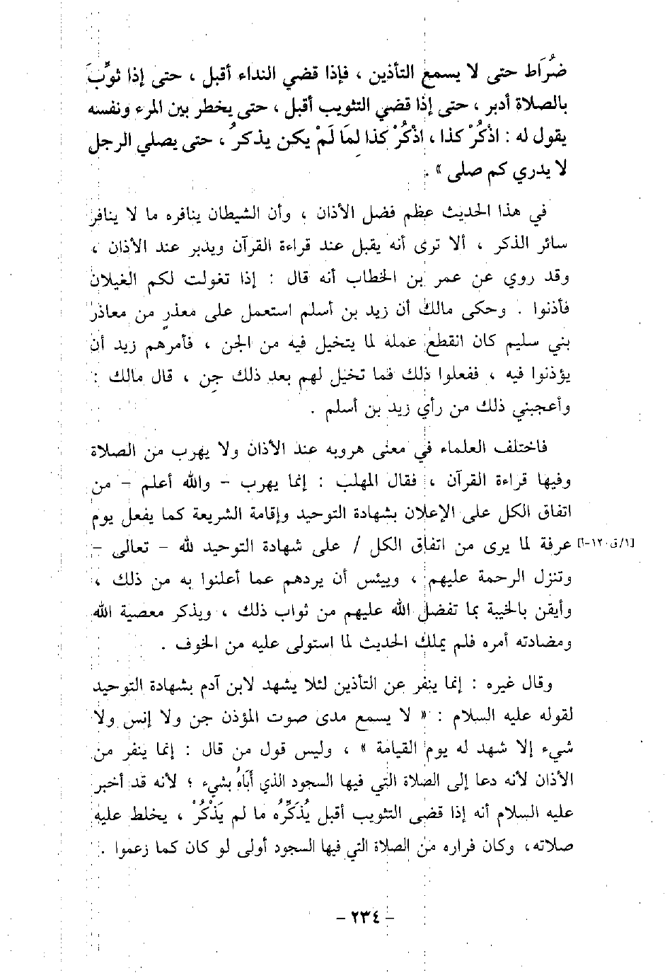 ضُرَاطٌ، حَتَّى لا يَسْمَعَ التَّأْذِينَ، فَإِذَا قَضَى النِّدَاءَ، أَقْبَلَ، حَتَّى إِذَا ثُوِّبَ بِالصَّلاةِ، أَدْبَرَ، حَتَّى إِذَا قَضَى التَّثْوِيبَ أَقْبَلَ، حَتَّى يَخْطِرَ بَيْنَ الْمَرْءِ وَنَفْسِهِ، يَقُولُ: اذْكُرْ كَذَا، اذْكُرْ كَذَا، لِمَا لَمْ يَكُنْ يَذْكُرُ، حَتَّى يَظَلَّ الرَّجُلُ لا يَدْرِي كَمْ صَلَّى) . فى هذا الحديث عظم فضل الأذان، وأن الشيطان ينافره ما لا ينافر سائر الذكر، ألا ترى أنه يقبل عند قراءة القرآن ويدبر عند الأذان، وقد روى عن عمر بن الخطاب أنه قال: إذا تغولت لكم الغيلان فأذنوا. وحكى مالك أن زيد بن أسلم استعمل على معذرٍ من معاذر بنى سليم كان انقطع عمله لما يتخيل فيه من الجن، فأمرهم زيد أن يؤذنوا فيه، ففعلوا ذلك فما تخيل لهم بعد ذلك جن، قال مالك: وأعجبنى ذلك من رأى زيد بن أسلم. فاختلف العلماء فى معنى هروبه عند الأذان ولا يهرب من الصلاة وفيها قراءة القرآن، فقال المهلب: إنما يهرب، والله أعلم، من اتفاق الكل على الإعلان بشهادة التوحيد وإقامة الشريعة كما يفعل يوم عرفة لما يرى من اتفاق الكل على شهادة التوحيد لله تعالى، وتنزل الرحمة عليهم، وييئس أن يردهم عما أعلنوا به من ذلك، وأيقن بالخيبة بما تفضل الله عليهم من ثواب ذلك، ويذكر معصية الله ومضادته أمره فلم يملك الحديث لما استولى عليه من الخوف. وقال غيره: إنما ينفر عن التأذين لئلا يشهد لابن آدم بشهادة التوحيد لقوله عليه السلام: (لا يسمع مدى صوت المؤذن جن ولا إنس ولا شىء إلا شهد له يوم القيامة) ، وليس قول من قال: إنما ينفر من الأذان لأنه دعا إلى الصلاة التى فيها السجود الذى أباهُ بشىء؛ لأنه قد أخبر عليه السلام، أنه إذا قضى التثويب أقبل يُذَكِّرُه ما لم يَذْكُرْ، يخلط عليه صلاته، وكان فراره من الصلاة التى فيها السجود أولى لو كان كما زعموا.