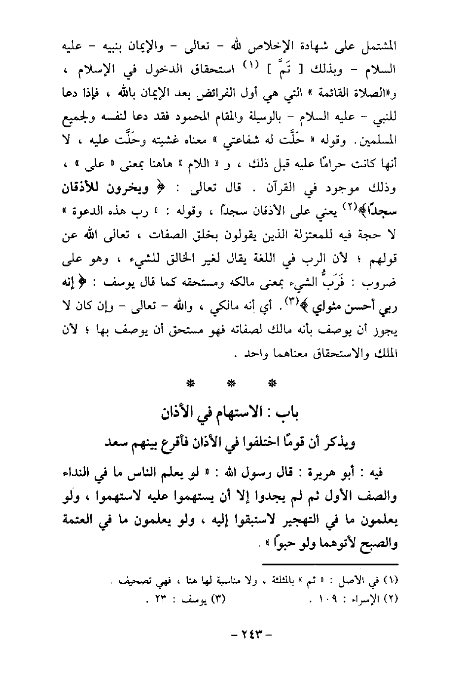 وَيُذْكَرُ أَنَّ أَقْوَامًا اخْتَلَفُوا فِي الأذَانِ، فَأَقْرَعَ بَيْنَهُمْ سَعْدٌ. / 12 - فيه: أَبو هُرَيْرَةَ: قال رَسُولَ اللَّهِ (صلى الله عليه وسلم) : (لَوْ يَعْلَمُ النَّاسُ مَا فِي النِّدَاءِ وَالصَّفِّ الأوَّلِ، ثُمَّ لَمْ يَجِدُوا إِلا أَنْ يَسْتَهِمُوا عَلَيْهِ لاسْتَهَمُوا، وَلَوْ يَعْلَمُونَ مَا فِي التَّهْجِيرِ لاسْتَبَقُوا إِلَيْهِ، وَلَوْ يَعْلَمُونَ مَا فِي الْعَتَمَةِ وَالصُّبْحِ، لأتَوْهُمَا وَلَوْ حَبْوًا) .