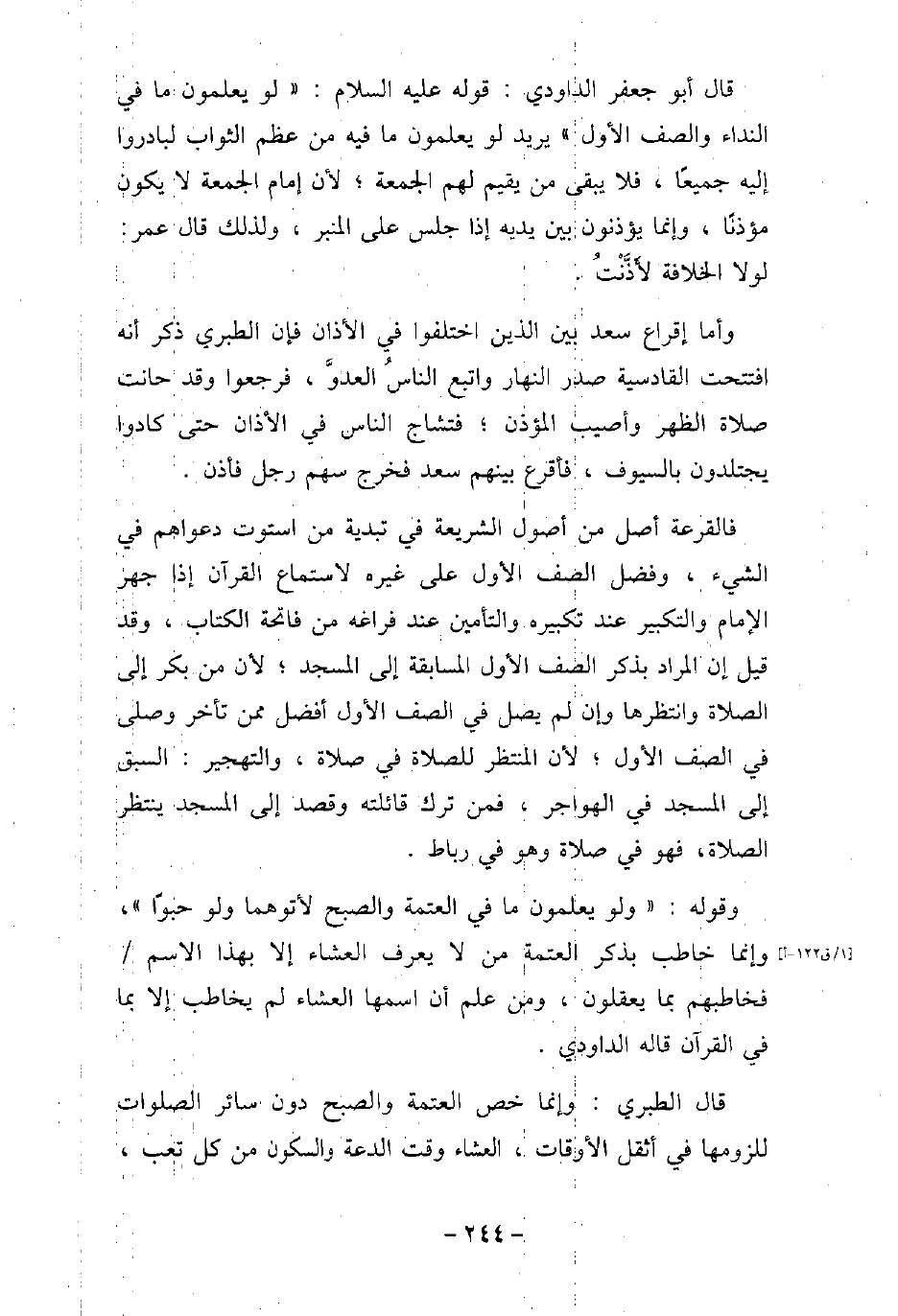 قال أبو جعفر الداودى: قوله عليه السلام: (لو يعلمون ما فى النداء والصف الأول) ، يريد لو يعلمون ما فيه من عظم الثواب لبادروا إليه جميعًا، فلا يبقى من يقيم لهم الجمعة؛ لأن إمام الجمعة لا يكون مؤذنًا، وإنما يؤذنون بين يديه إذا جلس على المنبر، ولذلك قال عمر: لولا الخلاف لأَذَّنُتُ. أما إقراع سعد بين الذين اختلفوا فى الأذان فإن الطبرى ذكر أنه افتتحت القادسية صدر النهار واتبع الناس العدو، فرجعوا وقد حانت صلاة الظهر وأصيب المؤذن؛ فتشاج الناس فى الأذان حتى كادوا يجتلدون بالسيوف، فأقرع بينهم سعد فخرج سهل رجل فأذن. فالقرعة أصل من أصول الشريعة فى تبدية من استوت دعواهم فى الشىء، وفضل الصف الأول على غيره لاستماع القرآن إذا جهر الإمام والتكبير عند تكبيره والتأمين عند فراغه من فاتحة الكتاب، وقد قيل: إن المراد بذكر الصف الأول المسابقة إلى المسجد؛ لأن مَنْ بَكَّر إلى الصلاة وانتظرها وإن لم يصل فى الصف الأول أفضل ممن تأخر وصلى فى الصف الأول؛ لأن المنتظر للصلاة فى صلاة، والتهجير: السبق إلى المسجد فى الهواجر، فمن ترك قائلته وقصد إلى المسجد ينتظر الصلاة، فهو من صلاة وهو فى رباط. وقوله: (ولو يعلمون ما فى العتمة والصبح لأتوهما ولو حبوًا) ، وإنما خاطب بذكر العتمة من لا يعرف العشاء إلا بهذا الاسم فخاطبهم بما يعقلون، ومن علم أن اسمها العشاء لم يخاطب إلا بما فى القرآن قاله الداودى. قال الطبرى: وإنما خص العتمة والصبح دون سائر الصلوات للزومها فى أثقل الأوقات، العشاء وقت الدعة والسكون من كل تعب،