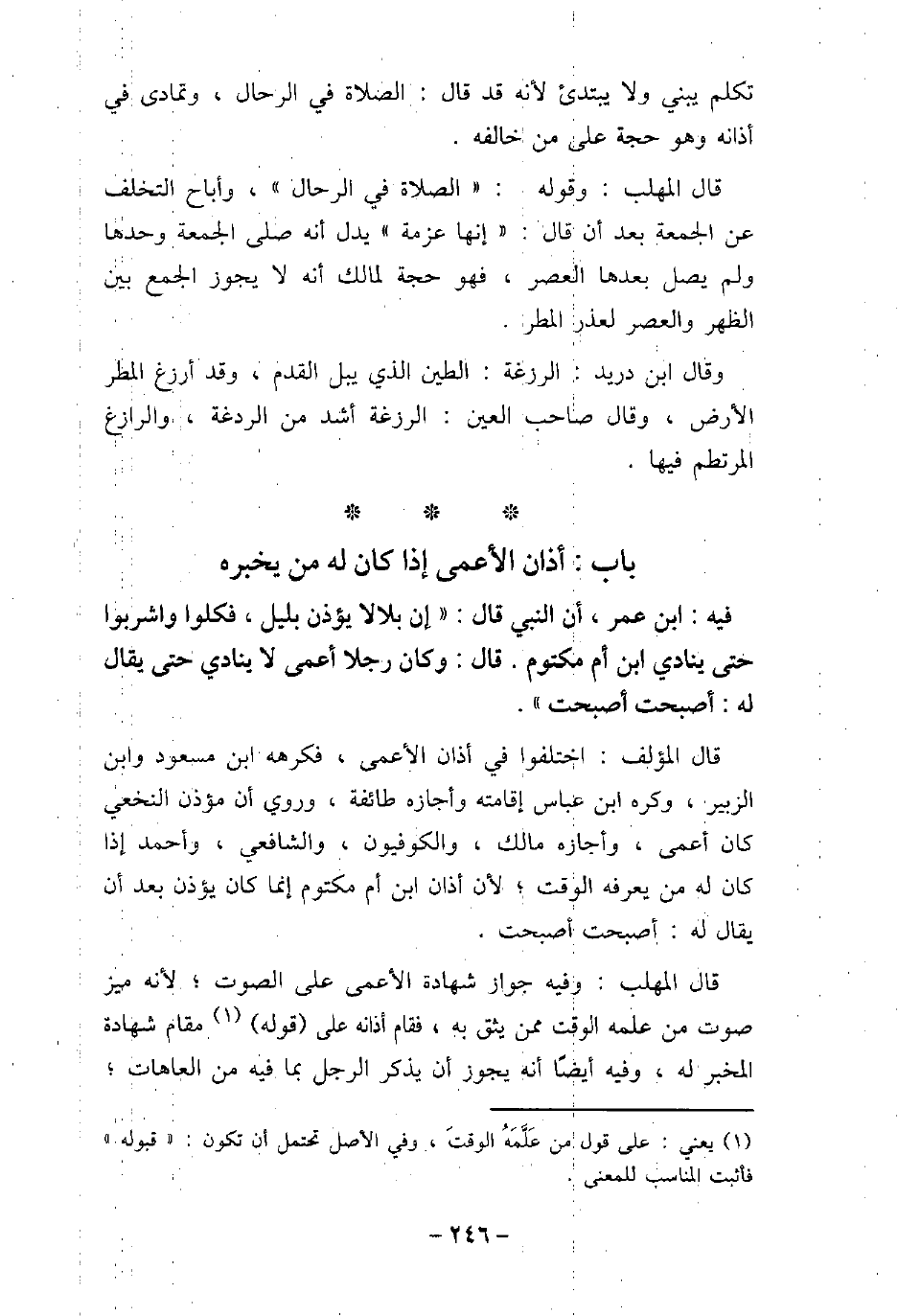تكلم يبنى ولا يبتدئ؛ لأنه قد قال: الصلاة فى الرحال، وتمادى فى أذانه وهو حجة على من خالفه. قال المهلب: وقوله: (الصلاة فى الرحال) ، وأباح التخلف عن الجمعة بعد أن قال: (إنها عزمة) يدل أنه صلى الجمعة وحدها ولم يصل بعدها العصر، فهو حجة لمالك أنه لا يجوز الجمع بين الظهر والعصر لعذر المطر. وقال ابن دريد: الرزغة: الطين الذى يبل القدم، وقد أرزغ المطر الأرض، وقال صاحب (العين) : الرزغة أشد من الردغة، والرازغ المرتطم فيها.