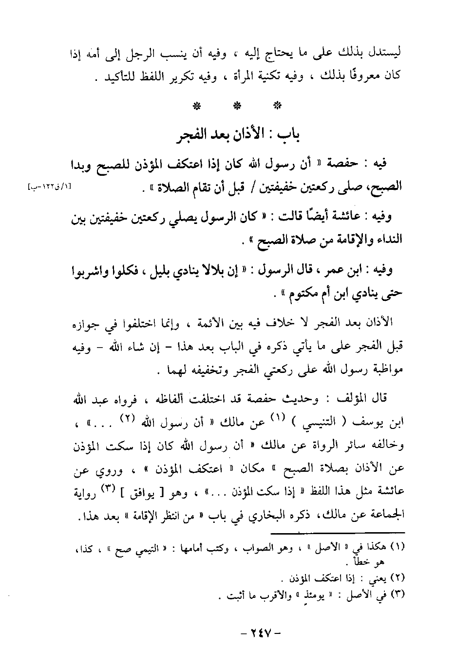 / 15 - فيه: حَفْصَةُ (أَنَّ رَسُولَ اللَّهِ (صلى الله عليه وسلم) كَانَ إِذَا اعْتَكَفَ الْمُؤَذِّنُ لِلصُّبْحِ، وَبَدَا الصُّبْحُ، صَلَّى رَكْعَتَيْنِ خَفِيفَتَيْنِ، قَبْلَ أَنْ تُقَامَ الصَّلاةُ) . / 16 - وفيه: عَائِشَةَ أيضًا قالت: (كَانَ الرسول (صلى الله عليه وسلم) يُصَلِّي رَكْعَتَيْنِ خَفِيفَتَيْنِ بَيْنَ النِّدَاءِ وَالإقَامَةِ مِنْ صَلاةِ الصُّبْحِ) . / 17 - وفيه: ابْنِ عُمَرَ قَالَ الرسول: (إِنَّ بِلالا يُنَادِي بِلَيْلٍ، فَكُلُوا، وَاشْرَبُوا، حَتَّى يُنَادِيَ ابْنُ أُمِّ مَكْتُومٍ) . الأذان بعد الفجر لا خلاف فيه بين الأئمة، وإنما اختلفوا فى جوازه قبل الفجر على ما يأتى ذكره فى الباب بعد هذا، إن شاء الله، وفيه مواظبة رسول الله على ركعتى الفجر وتخفيفه لهما. قال المؤلف: وحديث حفصة قد اختلفت ألفاظه، فرواه عبد الله بن يوسف التنيسى عن مالك: (أن رسول الله. . .) ، وخالفه سائر الرواة عن مالك: (أن رسول الله كان إذا سكت المؤذن عن الأذان بصلاة الصبح) ، مكان (اعتكف المؤذن) ، وروى عن عائشة مثل هذا اللفظ: (إذا سكت المؤذن. . .) ، وهو يوافق رواية الجماعة عن مالك، ذكره البخارى فى باب (من انتظر الإقامة) ، بعد هذا.