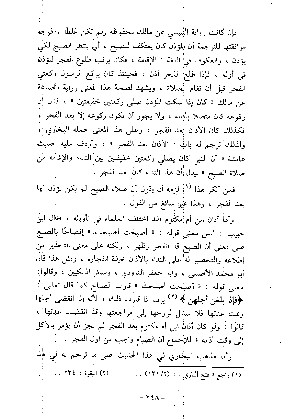 فإن كانت رواية التنيسى عن مالك محفوظة ولم تكن غلطًا، فوجه موافقتها للترجمة أن المؤذن كان يعتكف للصبح، أى ينتظر الصبح لكى يؤذن، والعكوف فى اللغة: الإقامة، فكان يرقب طلوع الفجر ليؤذن فى أوله، فإذا طلع الفجر أذن، فحينئذ كان يركع الرسول ركعتى الفجر قبل أن تقام الصلاة، ويشهد لصحة هذا المعنى رواية الجماعة عن مالك: (كان إذا سكت المؤذن صلى ركعتين خفيفتين) ، فدل أن ركوعه كان متصلاَ بأذانه، ولا يجوز أن يكون ركوعه إلا بعد الفجر، فكذلك كان الأذان بعد الفجر، وعلى هذا المعنى حمله البخارى، ولذلك ترجم له باب (الأذان بعد الفجر) ، وأردف عليه حديث عائشة: (أن النبى كان يصلى ركعتين خفيفتين بين النداء والإقامة من صلاة الصبح) ، ليدل أن هذا النداء كان بعد الفجر. فمن أنكر هذا لزمه أن يقول أن صلاة الصبح لم يكن يؤذن لها بعد الفجر، وهذا غير سائغ من القول. وأما أذان ابن أم مكتوم فقد اختلف العلماء فى تأويله، فقال ابن حبيب: ليس معنى قوله: (أصبحت أصبحت) إفصاحًا بالصبح على معنى أن الصبح قد انفجر وظهر، ولكنه على معنى التحذير من إطلاعه والتحضير له على النداء بالأذان خيفة انفجاره، ومثل هذا قال أبو محمد الأصيلى، وأبو جعفر الداودى، وسائر المالكيين، وقالوا: معنى قوله: (أصبحت أصبحت) ، قارب الصباح كما قال تعالى: (فإذا بلغن أجلهن) [البقرة: 234] ، يريد إذا قارب ذلك؛ لأنه إذا انقضى أجلها وتمت عدتها فلا سبيل لزوجها إلى مراجعتها وقد انقضت عدتها، قالوا: ولو كان أذان ابن أم مكتوم بعد الفجر لم يجز أن يؤمر بالأكل إلى وقت أذانه؛ للإجماع أن الصيام واجب من أول الفجر. وأما مذهب البخارى فى هذا الحديث على ما ترجم به فى هذا