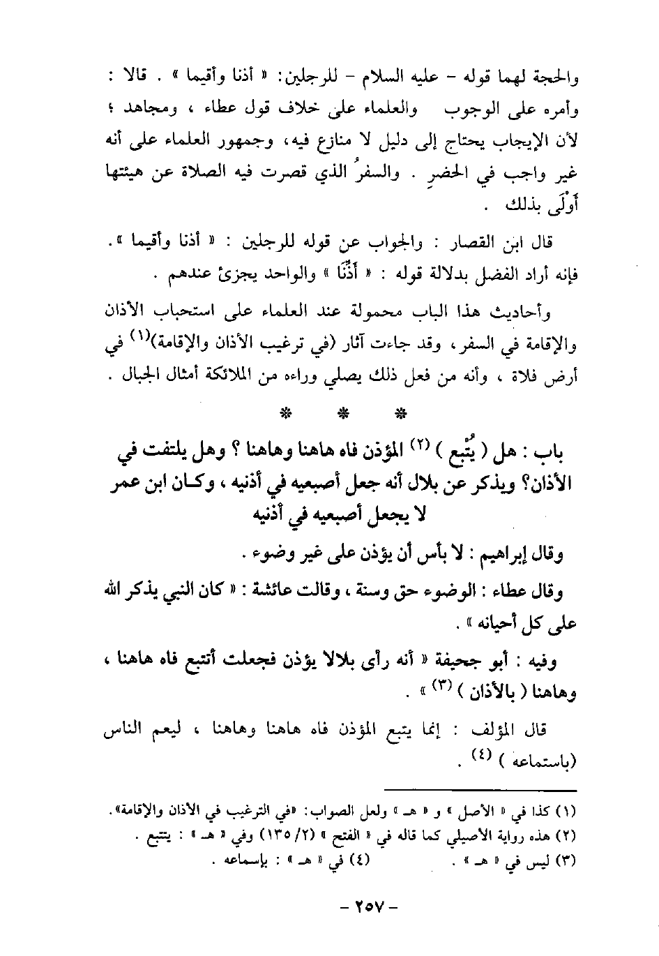 وَيُذْكَرُ عَنْ بِلالٍ أَنَّهُ جَعَلَ إِصْبَعَيْهِ فِي أُذُنَيْهِ. وَكَانَ ابْنُ عُمَرَ لا يَجْعَلُ إِصْبَعَيْهِ فِي أُذُنَيْهِ. وَقَالَ إِبْرَاهِيمُ: لا بَأْسَ أَنْ يُؤَذِّنَ عَلَى غَيْرِ وُضُوءٍ. وَقَالَ عَطَاءٌ: الْوُضُوءُ حَقٌّ وَسُنَّةٌ، وَقَالَتْ عَائِشَةُ: كَانَ النَّبِيُّ (صلى الله عليه وسلم) يَذْكُرُ اللَّهَ عَلَى كُلِّ أَحْيَانِهِ. / 28 - وفيه: أَبو جُحَيْفَةَ أَنَّهُ رَأَى بِلالا يُؤَذِّنُ، فَجَعَلْتُ أَتَتَبَّعُ فَاهُ هَاهُنَا وَهَاهُنَا بِالأذَانِ. قال المؤلف: إنما يتبع المؤذن فاه هاهنا وهاهنا، ليعم الناس باستماعه،