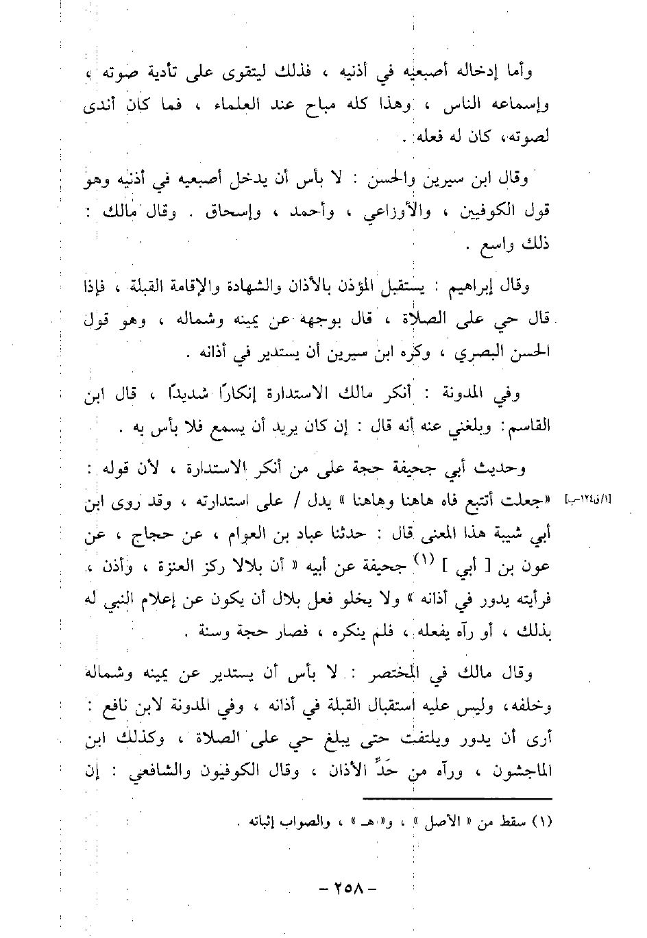 وأما إدخاله أصبعيه فى أذنيه، فذلك ليتقوى على تأدية صوته، وإسماعه الناس، وهذا كله مباح عند العلماء، فما كان أندى لصوته، كان له فعله. وقال ابن سيرين والحسن: لا بأس أن يدخل أصبعيه فى أذنيه وهو قول الكوفيين، والأوزاعى، وأحمد، وإسحاق، وقال مالك: ذلك واسع. وقال إبراهيم: يستقبل المؤذن بالأذان والشهادة والإقامة القبلة، فإذا قال: حى على الصلاة، قال: بوجهه عن يمينه وشماله، وهو قول الحسن البصرى، وكره ابن سيرين أن يستدير فى أذانه. وفى (المدونة) : أنكر مالك الاستدارة إنكارًا شديدًا، قال ابن القاسم: وبلغنى عنه أنه قال: إن كان يريد أن يسمع فلا بأس به. وحديث أبى جحيفة حجة على من أنكر الاستدارة؛ لأن قوله: (جعلت أتتبع فاه هاهنا وهاهنا) يدل على استدارته، وقد روى ابن أبى شيبة هذا المعنى قال: حدثنا عباد ابن العوام، عن حجاج، عن عون بن أبى جحيفة، عن أبيه: (أن بلالاً ركز العنزة، وأذن، فرأيته يدور فى أذانه) ، ولا يخلو فعل بلال أن يكون عن إعلام النبى له بذلك، أو رآه يفعله، فلم ينكره، فصار حجة وسنة. وقال مالك فى (المختصر) : لا بأس أن يستدير عن يمينه وشماله وخلفه، وليس عليه استقبال القبلة فى أذانه، وفى (المدونة) لابن نافع: أرى أن يدور ويلتفت حتى يبلغ حى على الصلاة، وكذلك ابن الماجشون، ورآه من حَدِّ الأذان، وقال الكوفيون، والشافعى: إن