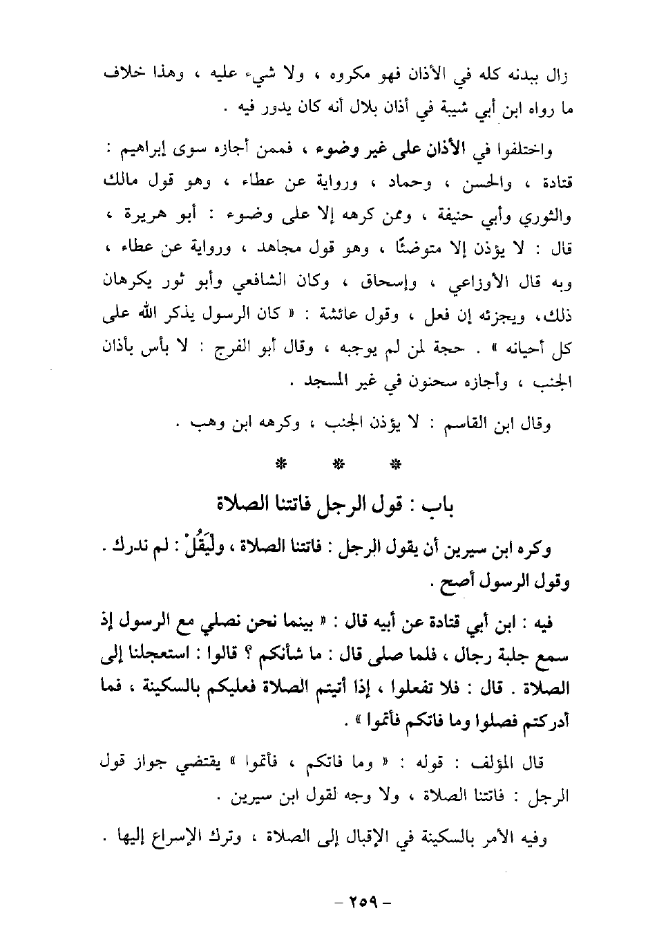 وَكَرِهَ ابْنُ سِيرِينَ أَنْ يَقُولَ: فَاتَتْنَا الصَّلاةُ، لِيَقُلْ: لَمْ نُدْرِكْ وَقَوْلُ الرسول (صلى الله عليه وسلم) أَصَحُّ / 29 - فيه: ابْنِ أَبِي قَتَادَةَ عَنْ أَبِيهِ قَال: َ (بَيْنَمَا نَحْنُ نُصَلِّي مَعَ الرسول (صلى الله عليه وسلم) إِذْ سَمِعَ جَلَبَةَ رِجَالٍ، فَلَمَّا صَلَّى، قَالَ: (مَا شَأْنُكُمْ) ؟ قَالُوا: اسْتَعْجَلْنَا إِلَى الصَّلاةِ، قَالَ: (فَلا تَفْعَلُوا إِذَا أَتَيْتُمُ الصَّلاةَ فَعَلَيْكُمْ بِالسَّكِينَةِ، فَمَا أَدْرَكْتُمْ فَصَلُّوا، وَمَا فَاتَكُمْ فَأَتِمُّوا) . قال المؤلف: قوله: (وما فاتكم، فأتموا) ، يقتضى جواز قول الرجل: فاتتنا الصلاة، ولا وجه لقول ابن سيرين. وفيه: الأمر بالسكينة فى الإقبال إلى الصلاة، وترك الإسراع إليها.