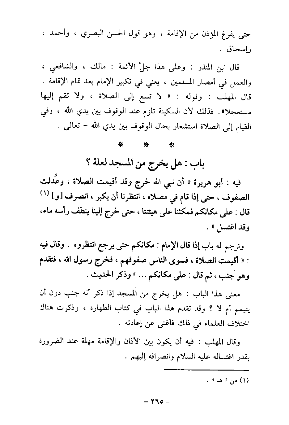 / 33 - فيه: أَبو هُرَيْرَةَ (أَنَّ نبى اللَّهِ (صلى الله عليه وسلم) خَرَجَ وَقَدْ أُقِيمَتِ الصَّلاةُ، وَعُدِّلَتِ الصُّفُوفُ، حَتَّى إِذَا قَامَ فِي مُصَلاهُ، انْتَظَرْنَا أَنْ يُكَبِّرَ، انْصَرَفَ، قَالَ: عَلَى مَكَانِكُمْ، فَمَكَثْنَا عَلَى هَيْئَتِنَا، حَتَّى خَرَجَ إِلَيْنَا، يَنْطِفُ رَأْسُهُ مَاءً، وَقَدِ اغْتَسَلَ) . وترجم له: باب إِذَا قَالَ الإمَامُ: مَكَانَكُمْ حَتَّى رَجَعَ انْتَظَرُوهُ. / 34 - وقال فيه: (أُقِيمَتِ الصَّلاةُ، فَسَوَّى النَّاسُ صُفُوفَهُمْ، فَخَرَجَ رَسُولُ اللَّهِ (صلى الله عليه وسلم) ، فَتَقَدَّمَ، وَهُوَ جُنُبٌ، ثُمَّ قَالَ: عَلَى مَكَانِكُمْ.) . وذكر الحديث. معنى هذا الباب: هل يخرج من المسجد إذا ذكر أنه جنب دون أن يتيمم أم لا؟ وقد تقدم هذا الباب فى كتاب الطهارة، وذكرت هناك اختلاف العلماء فى ذلك فأغنى عن إعادته. وقال المهلب: فيه أن يكون بين الأذان والإقامة مهلة عند الضرورة بقدر اغتساله عليه السلام، وانصرافه إليهم.