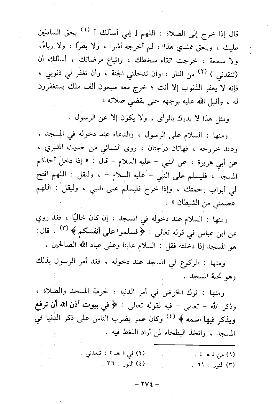 قال إذا خرج إلى الصلاة: اللهم إنى أسألك بحق السائلين عليك، وبحق ممشاى هذا، لم أخرجه أشرا، ولا بطرًا، ولا رياءً، ولا سمعة، خرجت اتقاء سخطك، واتباع مرضاتك، أسألك أن تنقذنى من النار، وأن تدخلنى الجنة، وأن تغفر لى ذنوبى، فإنه لا يغفر الذنوب إلا أنت؛ خرج معه سبعون ألف ملك يستغفرون له، وأقبل الله عليه بوجهه حتى يقضى صلاته) . ومثل هذا لا يدرك بالرأى، ولا يكون إلا عن الرسول. ومنها: السلام على الرسول، والدعاء عند دخوله فى المسجد، وعند خروجه، فهاتان درجتان، روى النسائى من حديث المقبرى، عن أبى هريرة، عن النبى، عليه السلام، قال: (إذا دخل أحدكم المسجد، فليسلم على النبى، عليه السلام، وليقل: اللهم افتح لى أبواب رحمتك، وإذا خرج فليسلم على النبى، وليقل: اللهم اعصمنى من الشيطان) . ومنها: السلام عند دخوله فى المسجد، إن كان خاليًا، فقد روى عن ابن عباس فى قوله تعالى: (فسلموا على أنفسكم) [النور: 61] ، قال: هو المسجد إذا دخلته فقل: السلام علينا وعلى عباد الله الصالحين. ومنها: الركوع فى المسجد عند دخوله، فقد أمر الرسول بذلك وهو تحية المسجد. ومنها: ترك الخوض فى أمر الدنيا؛ لحرمة المسجد والصلاة، وذكر الله تعالى، فيه لقوله تعالى: (فى بيوت أذن الله أن ترفع ويذكر فيها اسمه) [النور: 36] ، وكان عمر يضرب الناس على ذكر الدنيا فى المسجد، واتخذ البطحاء لمن أراد اللغط فيه.