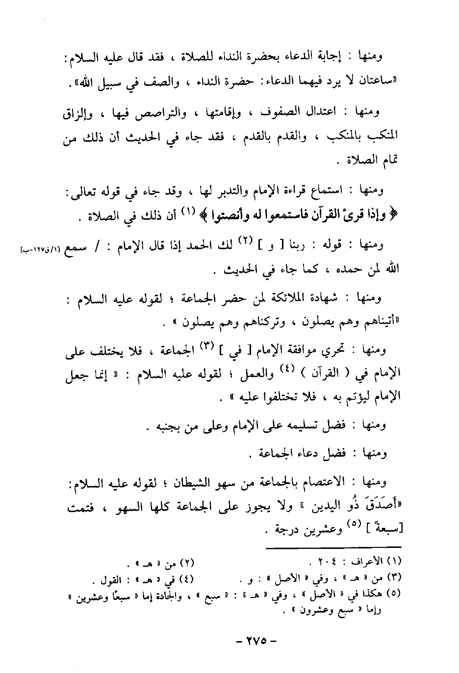ومنها: إجابة الدعاء بحضرة النداء للصلاة، فقد قال عليه السلام: (ساعتان لا يرد فيهما الدعاء: حضرة النداء، والصف فى سبيل الله) . ومنها: اعتدال الصفوف، وإقامتها، والتراصص فيها، وإلزاق المنكب بالمنكب، والقدم بالقدم، فقد جاء فى الحديث أن ذلك من تمام الصلاة. ومنها: استماع قراءة الإمام والتدبر لها، وقد جاء فى قوله تعالى: (وإذا قرئ القرآن فاستمعوا له وأنصتوا) [الأعراف: 204] ، أن ذلك فى الصلاة. ومنها: قوله: ربنا ولك الحمد إذا قال الإمام: سمع الله لمن حمده، كما جاء فى الحديث. ومنها: شهادة الملائكة لمن حضر الجماعة؛ لقوله عليه السلام: (أتيناهم وهم يصلون، وتركناهم وهم يصلون) . ومنها: تحرى موافقة الإمام فى الجماعة، فلا يختلف على الإمام فى القرآن والعمل؛ لقوله عليه السلام: (إنما جعل الإمام ليؤتم به، فلا تختلفوا عليه) . ومنها: فضل تسليمه على الإمام وعلى من بجنبه. ومنها: فضل دعاء الجماعة. ومنها: الاعتصام بالجماعة من سهو الشيطان؛ لقوله عليه السلام: (أَصَدَقَ ذُو اليدين) ، ولا يجوز على الجماعة كلها السهو، فتمت سبعةً وعشرين درجة.