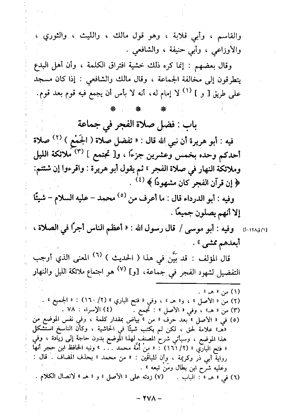 / 41 - فيه: أَبَو هُرَيْرَةَ أن نبى الله قَالَ: (تَفْضُلُ صَلاةُ الْجَمْعِ صَلاةَ أَحَدِكُمْ وَحْدَهُ بِخَمْسٍ وَعِشْرِينَ جُزْءًا، وَتَجْتَمِعُ مَلائِكَةُ اللَّيْلِ وَمَلائِكَةُ النَّهَارِ فِي صَلاةِ الْفَجْرِ) ، ثُمَّ يَقُولُ أَبُو هُرَيْرَةَ: وَاقْرَءُوا إِنْ شِئْتُمْ: (إِنَّ قُرْآنَ الْفَجْرِ كَانَ مَشْهُودًا) [الإسراء 78] . / 42 - وفيه: أَبُو الدَّرْدَاء قال: مَا أَعْرِفُ مِنْ مُحَمَّدٍ عليه السلام، شَيْئًا إِلا أَنَّهُمْ يُصَلُّونَ جَمِيعًا. / 43 - وفيه: أَبِي مُوسَى، قَالَ رسول الله: (أَعْظَمُ النَّاسِ أَجْرًا فِي الصَّلاةِ أَبْعَدُهُمْ مَمْشًى) . قال المؤلف: قد بيَّن فى هذا الباب المعنى الذى أوجب التفضيل لشهود الفجر فى جماعة، وهو اجتماع ملائكة الليل، والنهار