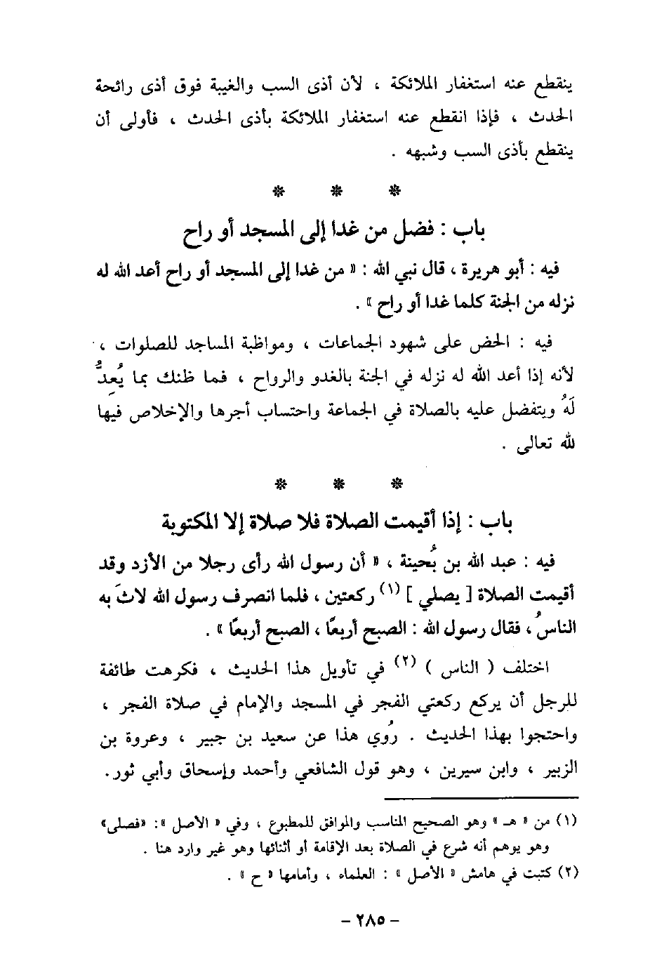 / 50 - فيه: أَبو هُرَيْرَةَ، قال نَّبِيِّ الله: (مَنْ غَدَا إِلَى الْمَسْجِدِ أوَ رَاحَ، أَعَدَّ اللَّهُ لَهُ نُزُلَهُ مِنَ الْجَنَّةِ كُلَّمَا غَدَا أَوْ رَاحَ) . فيه: الحض على شهود الجماعات، ومواظبة المساجد للصلوات؛ لأنه إذا أعد الله له نزله فى الجنة بالغدو والرواح، فما ظنك بما يُعِدُّ له ويتفضل عليه بالصلاة فى الجماعة واحتساب أجرها والإخلاص فيها لله تعالى.