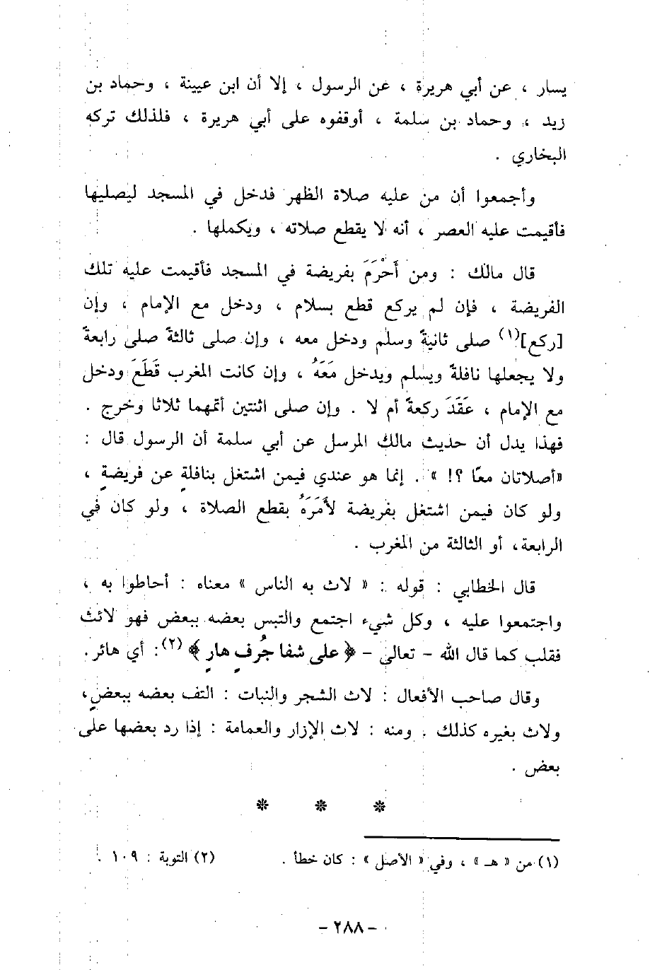 يسار، عن أبى هريرة، عن الرسول، إلا أن ابن عيينة، وحماد بن زيد، وحماد بن سلمة، أوقفوه على أبى هريرة، فلذلك تركه البخارى. وأجمعوا أن من عليه صلاة الظهر، فدخل فى المسجد ليصليها فأقيمت عليه العصر، أنه لا يقطع صلاته، ويكملها. قال مالك: ومن أحرم بفريضة فى المسجد فأقيمت عليه تلك الفريضة، فإن لم يركع قطع بسلام، ودخل مع الإمام، وإن ركع صلى ثانيةً وسلم ودخل معه، وإن صلى ثالثةً صلى رابعةً، ولا يجعلها نافلةً ويسلم ويدخل معه، وإن كانت المغرب قطع، ودخل مع الإمام، عقد ركعةً أم لا، وإن صلى اثنتين أتمهما ثلاثًا وخرج، فهذا يدل أن حديث مالك المرسل عن أبى سلمة أن الرسول قال: (أصلاتان معًا؟) ، إنما هو عندى فيمن اشتغل بنافلةٍ عن فريضةٍ، ولو كان فيمن اشتغل بفريضة لأمرهُ بقطع الصلاة، ولو كان فى الرابعة، أو الثالثة من المغرب. قال الخطابى: قوله: (لاث به الناس) ، معناه: أحاطوا به، واجتمعوا عليه، وكل شىء اجتمع والتبس بعضه ببعض فهو لائث، فقلب كما قال الله تعالى: (على شفا جُرفٍ هارٍ) [التوبة: 109] ، أى هائر. وقال صاحب (الأفعال) : لاث الشجر والنبات، التف بعضه ببعضٍ، ولاق بغيره كذلك، ومنه: لاث الإزار والعمامة: إذا رد بعضها على بعض.