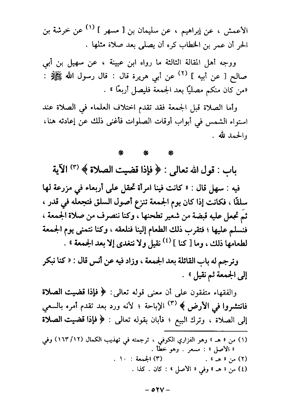 / 59 - فيه: سَهْلِ قَالَ: (كَانَتْ فِينَا امْرَأَةٌ تَحْقَلُ عَلَى أَرْبِعَاءَ فِي مَزْرَعَةٍ لَهَا سِلْقًا، فَكَانَتْ إِذَا كَانَ يَوْمُ جُمُعَةٍ، تَنْزِعُ أُصُولَ السِّلْقِ، فَتَجْعَلُهُ فِي قِدْرٍ، ثُمَّ تَجْعَلُ عَلَيْهِ قَبْضَةً مِنْ شَعِيرٍ تَطْحَنُهَا، وَكُنَّا نَنْصَرِفُ مِنْ صَلاةِ الْجُمُعَةِ، فَنُسَلِّمُ عَلَيْهَا، فَتُقَرِّبُ ذَلِكَ الطَّعَامَ إِلَيْنَا، فَنَلْعَقُهُ، وَكُنَّا نَتَمَنَّى يَوْمَ الْجُمُعَةِ لِطَعَامِهَا ذَلِكَ، ومَا كُنَّا نَقِيلُ وَلا نَتَغَدَّى إِلا بَعْدَ الْجُمُعَةِ) . وترجم له: (باب الْقَائِلَةِ بَعْدَ الْجُمُعَةِ) . / 60 - وزاد فيه: عَنِ أَنَس قال: (كُنَّا نُبَكِّرُ إِلَى الْجُمُعَةِ ثُمَّ نَقِيلُ) . والفقهاء متفقون على أن معنى قوله تعالى: (فإذا قضيت الصلاة