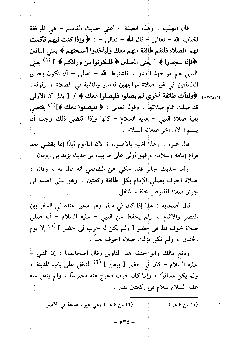 قال المهلب: وهذه الصفة، أعنى حديث القاسم، هى الموافقة لكتاب الله تعالى، قال الله تعالى: (وإذا كنت فيهم فأقمت لهم الصلاة فلتقم طائفة منهم معك وليأخذوا أسلحتهم (، يعنى الباقين) فإذا سجدوا (، يعنى المصلين) فليكونوا من ورائكم) [النساء: 102، 103] ، يعنى الذين هم مواجهة العدو، فاشترط الله تعالى، أن تكون إحدى الطائفتين فى غير صلاة مواجهين للعدو والثانية فى الصلاة، وقوله: (ولتأت طائفة أخرى لم يصلوا فليصلوا معك (، يدل أن الأولى قد صلت تمام صلاتها، وقوله تعالى: (فليصلوا معك (، يقتضى بقية صلاة النبى، عليه السلام، كلها وإذا اقتضى ذلك وجب أن يسلم؛ لأن آخر صلاته السلام. قال غيره: وهذا أشبه بالأصول؛ لأن المأموم أبدًا إنما يقضى بعد فراغ إمامه وسلامه، فهو أولى على ما بيناه من حديث يزيد بن رومان. وأما حديث جابر فقد حكى عن الشافعى أنه قال به، وقال: صلاة الخوف يصلى الإمام بكل طائفة ركعتين، وهو على أصله فى جواز صلاة المفترض خلف المتنفل. قال أصحابه: هذا إذا كان فى سفر وهو مخير عنده فى السفر بين القصر والإتمام، ولم يحفظ عن النبى، عليه السلام، أنه صلى صلاة خوف قط فى حضر ولم يكن له حرب فى حضر إلا يوم الخندق، ولم تكن نزلت صلاة الخوف بعدُ. ودفع مالك، وأبو حنيفة هذا التأويل وقال أصحابهما: إن النبى، عليه السلام، كان فى حضر ببطن النخل على باب المدينة، ولم يكن مسافرًا، وإنما كان خوف فخرج منه محترسًا، ولم ينقل عنه عليه السلام، سلام فى ركعتين بهم.