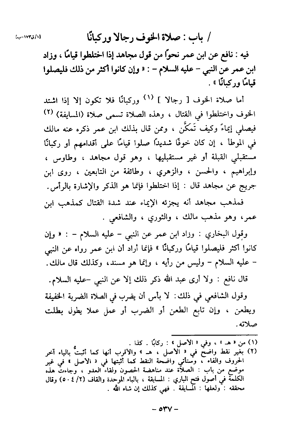 / 62 - فيه: نافع، عن ابْنِ عُمَرَ، نَحْوًا مِنْ قَوْلِ مُجَاهِدٍ: إِذَا اخْتَلَطُوا قِيَامًا، وَزَادَ ابْنُ عُمَرَ عَنِ النَّبِيِّ (صلى الله عليه وسلم) : (وَإِنْ كَانُوا أَكْثَرَ مِنْ ذَلِكَ، فَلْيُصَلُّوا قِيَامًا وَرُكْبَانًا) . أما صلاة الخوف رجالاً وركبانًا، فلا تكون إلا إذا اشتد الخوف واختلطوا فى القتال، وهذه الصلاة تسمى صلاة المسايفة، فيصلى إيماءً وكيف تمكن، وممن قال بذلك ابن عمر ذكره عنه مالك فى الموطأ، إن كان خوفًا شديدًا صلوا قيامًا على إقدامهم أو ركبانًا مستقبلى القبلة أو غير مستقبليها، وهو قول مجاهد، وطاوس، وإبراهيم، والحسن، والزهرى، وطائفة من التابعين، روى ابن جريج عن مجاهد قال: إذا اختلطوا فإنما هو الذكر والإشارة بالرأس. فمذهب مجاهد أنه يجزئه الإيماء عند شدة القتال كمذهب ابن عمر، وهو مذهب مالك، والثورى، والشافعى. وقول البخارى: وزاد ابن عمر عن النبى، عليه السلام: (وإن كانوا أكثر فليصلوا قيامًا وركبانًا) ، فإنما أراد أن ابن عمر رواه عن النبى، عليه السلام، وليس من رأيه، وإنما هو مسند، وكذلك قال مالك. قال نافع: ولا أرى عبد الله ذكر ذلك إلا عن النبى، عليه السلام. وقول الشافعى فى ذلك: لا بأس أن يضرب فى الصلاة الضربة الخفيفة ويطعن، وإن تابع الطعن أو الضرب أو عمل عملاً يطول بطلت صلاته.